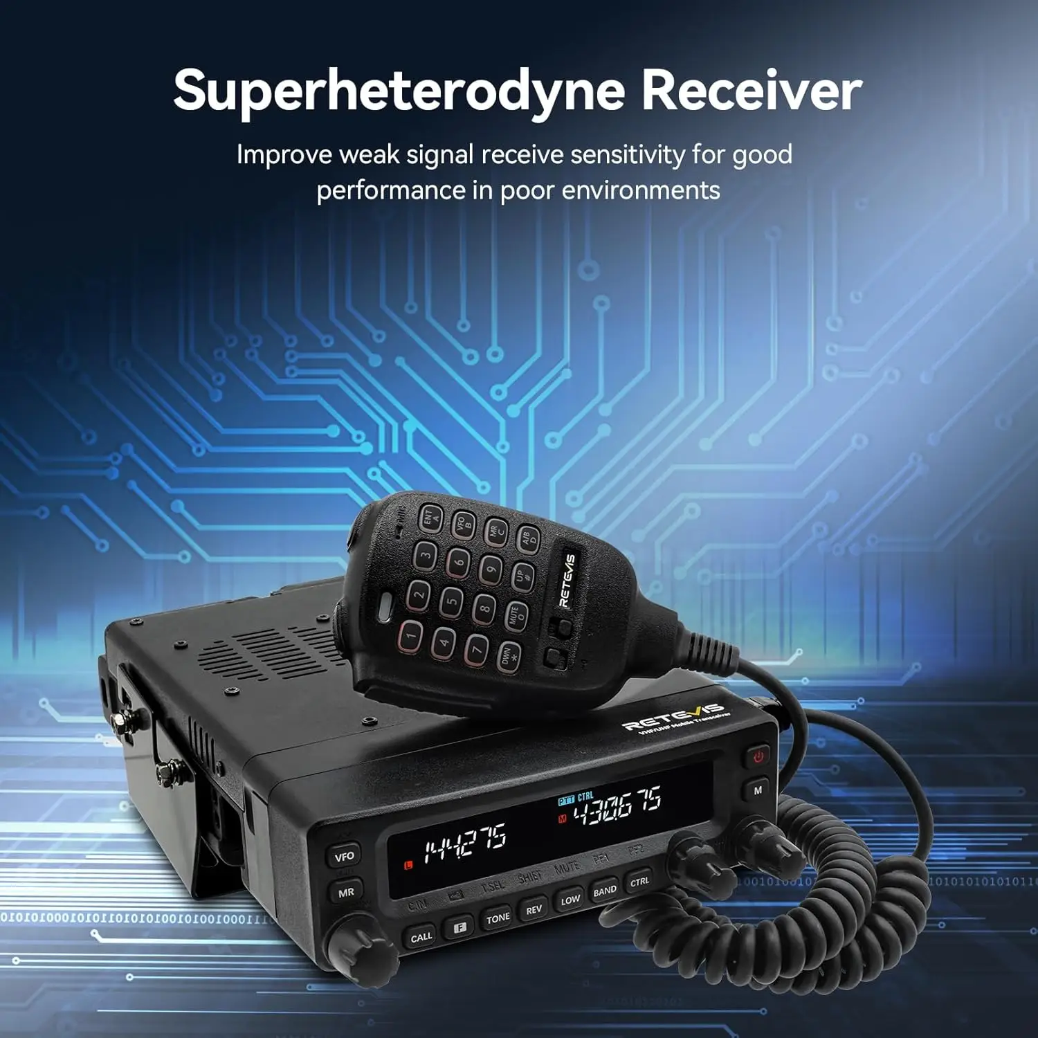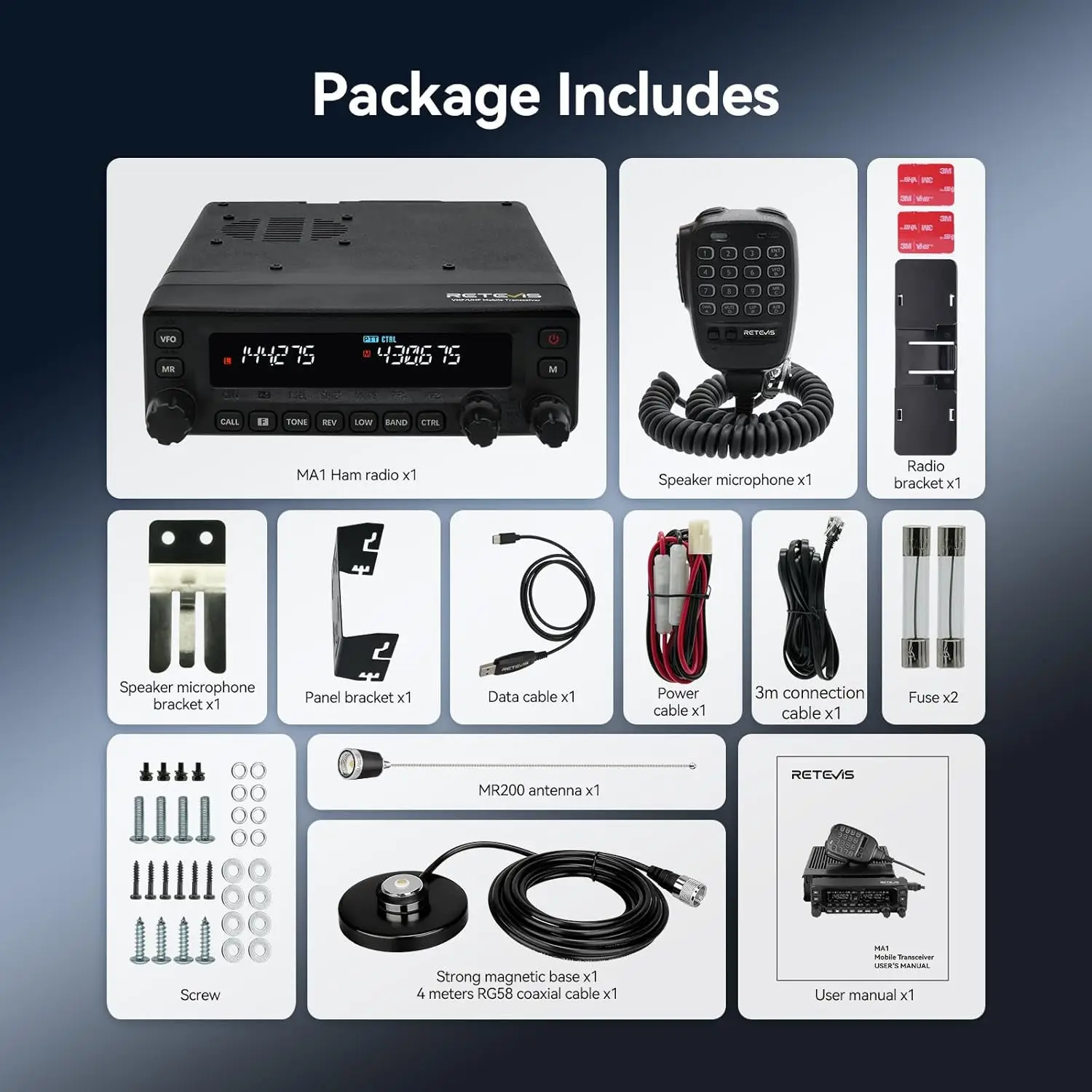 Il Retevis MA1 è un potente ricetrasmettitore veicolare con potenza di 50W, progettato per garantire comunicazioni chiare e stabili su lunghe distanze. Include un'antenna MR200 per prestazioni ottimali.