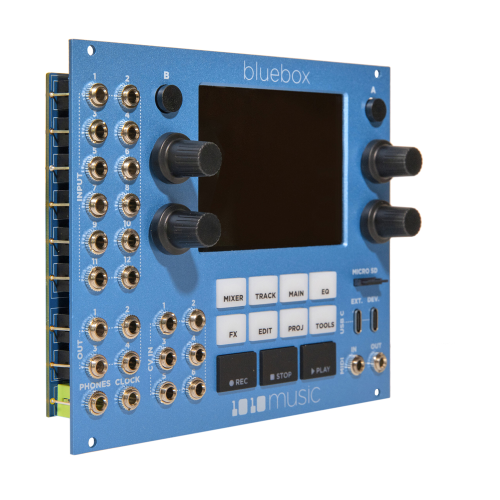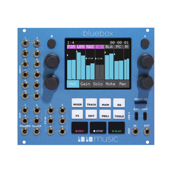 Nel campo degli effetti, 1010 Music gode già di una buona reputazione nel mondo modulare Eurorack, in quanto gli effetti di invio interni Delay e il riverbero, nonché il compressore master sono di alta qualità. Le tracce selezionate vengono registrate sulla scheda MicroSD con audio di qualità da studio a 24 bit / 48 kHz; sono incluse anche le impostazioni degli effetti e del routing. Il tempo massimo di registrazione dipende dalle dimensioni del supporto di memoria. Dopo la registrazione, è possibile trascinare le tracce dalla scheda di memoria alla DAW e lavorarci. Il collegamento alle apparecchiature MIDI è versatile. MIDI sono disponibili ingressi e uscite tramite adattatori TRS per la sincronizzazione con una drum machine o un master sequencer. USB-C EXT consente di collegare un controller per gestire più tracce contemporaneamente. Tramite USB-C DEV il mix stereo viene trasferito direttamente a una DAW. BlueBox Eurorack Edition ha tutto ciò che serve per essere il mixer e il registratore centrale del sistema modulare. Sia che si tratti di un cavallo di battaglia in studio, di una sorgente di riproduzione per materiale preregistrato o per il mixaggio e la registrazione di sessioni dal vivo, BlueBox è in grado di gestire tutto.