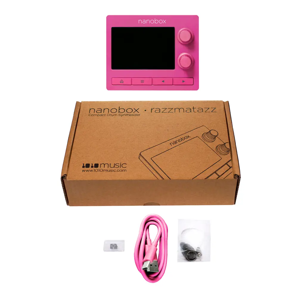 1010music, il nome dice tutto: il pratico drum computer da tavolo Nanobox Razzmatazz è presentato in un involucro ultracompatto con un’attenzione particolare alla sintesi FM e al campionamento. Il piccolo batterista genera otto tracce di batteria simultaneamente ed è riproducibile in polifonia a otto voci. I suoi suoni sono costituiti da campioni WAV, FM-Synthese o da una combinazione di entrambi e possono essere ampiamente personalizzati utilizzando filtri, inviluppo, distorsione e risonatore. Per la rifinitura finale vengono utilizzati gli effetti delay, riverbero, distorsione e bitcrusher. Razzmatazz esce dalla fabbrica con 120 drum kit preimpostati; i suoni inclusi sono stati creati da sound designer di dub, techno, IDM, Classic rock e altri generi. La drum machine non si limita affatto a ciò che offrono i campioni di Factory: è possibile importare a piacimento campioni propri in formato WAV della durata massima di 30 secondi e l’ingresso audio consente il campionamento diretto di una sorgente sonora esterna, ad esempio un sintetizzatore, un GameBoy o uno smartphone, nel dispositivo. Grazie al touchscreen da 2″ e alle due manopole, si ottiene un flusso di lavoro intuitivo, che consente di raggiungere rapidamente i parametri desiderati e di modellare i suoni. Inoltre, è possibile utilizzare il touchscreen per programmare il sequencer TR integrato a 64 passi e suonare gli otto suoni con le dita. Un’implementazione MIDI completa e connessioni MIDI e audio comuni consentono una facile integrazione in qualsiasi configurazione.