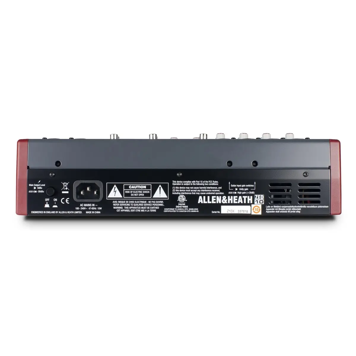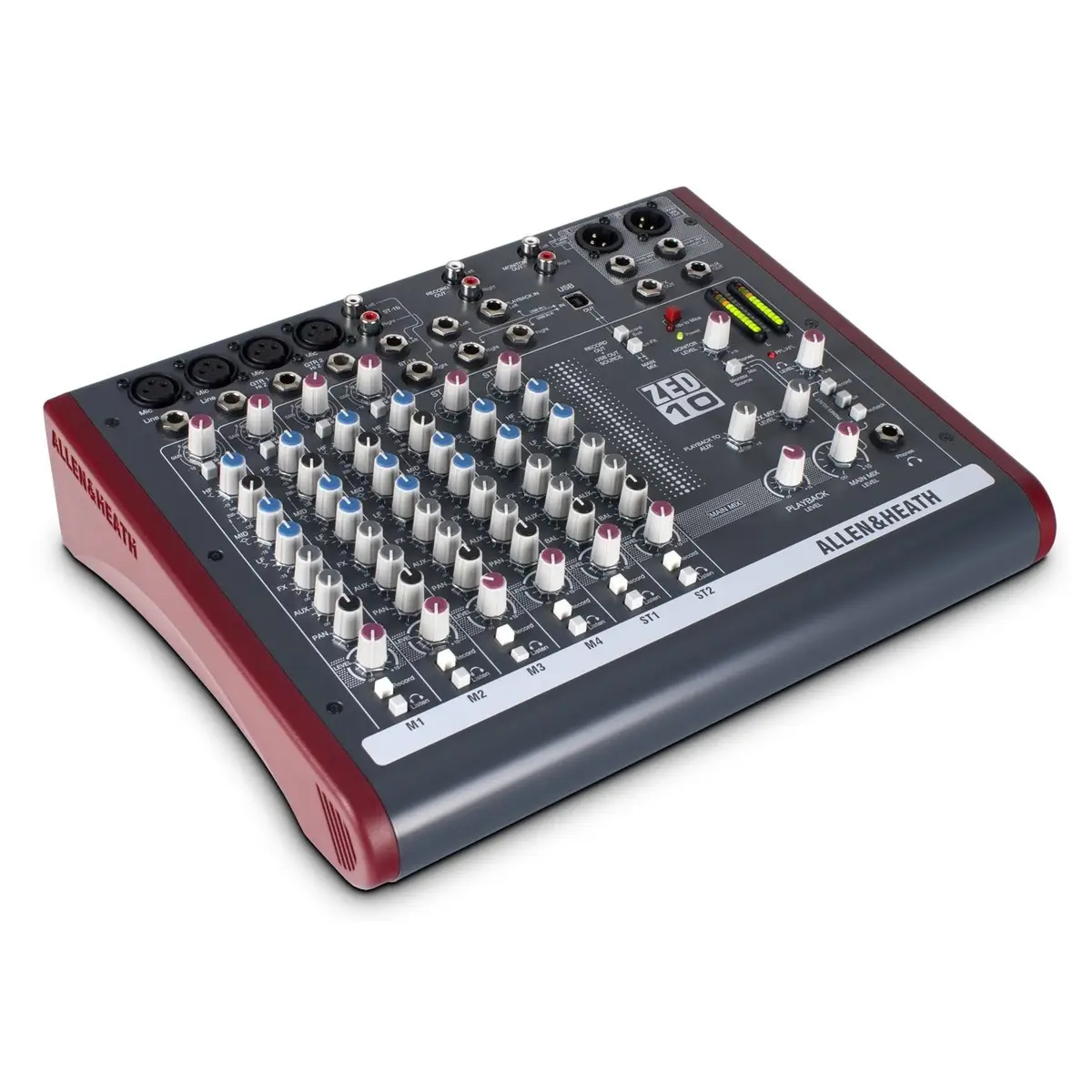 Lo ZED 10 di Allen & Heath è un piccolo e straordinario mixer per piccole band. È estremamente portatile e può essere utilizzato sia per le registrazioni dal vivo che in studio. È dotato di un ingresso/uscita audio USB configurabile che facilita la registrazione stereo. Le chitarre possono essere collegate direttamente al mixer tramite gli ingressi ad alta impedenza appositamente progettati, mentre il mixer dispone di due ingressi stereo per lettori MP3/CD o tastiere. Il mixer è inoltre dotato di uscite stereo XLR professionali e di una sezione di monitoraggio flessibile con uscite per cuffie e altoparlanti.