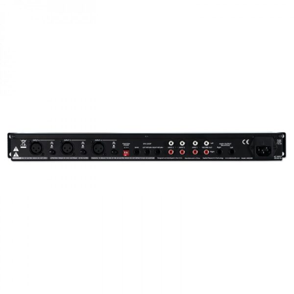 - Connessioni d’ingresso: XLR-F bilanciato (3), ¼ di pollice sbilanciato (2), RCA (6), 1/8 di pollice bilanciato (1)