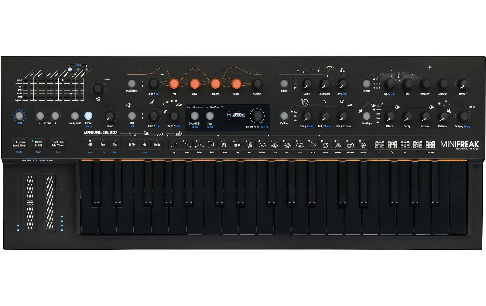 Nonostante la sua preferenza per un sound design selvaggio ed esplorativo, il MiniFreak Stellar è uno strumento dal carattere forte. Mentre la tastiera a 37 tasti completamente nera, sensibile alla velocità con aftertouch e la funzionalità dinamica Seq/Arp lo rendono la prima scelta per le esibizioni dal vivo, le funzioni del generatore casuale ti aiutano a trovare nuove idee in modo giocoso in studio.