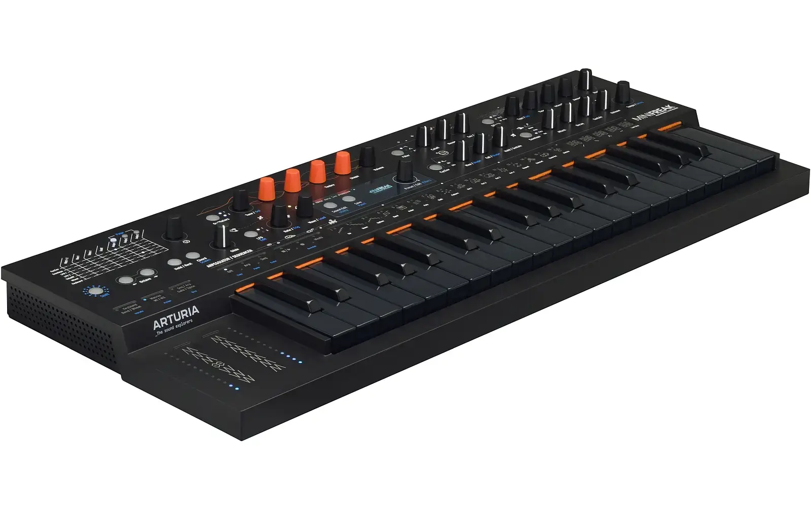 Non sono solo gli eleganti tasti completamente neri a catturare l’attenzione. Il MiniFreak Stellar è decorato con una grafica giocosa che dà vita alla catena del segnale e simboleggia l’effetto unico di ciascun controllo. Dagli UFO di risonanza ai lanci di razzi ADSR, prendi il controllo del tuo suono con un controller ultraterreno. I due motori audio digitali