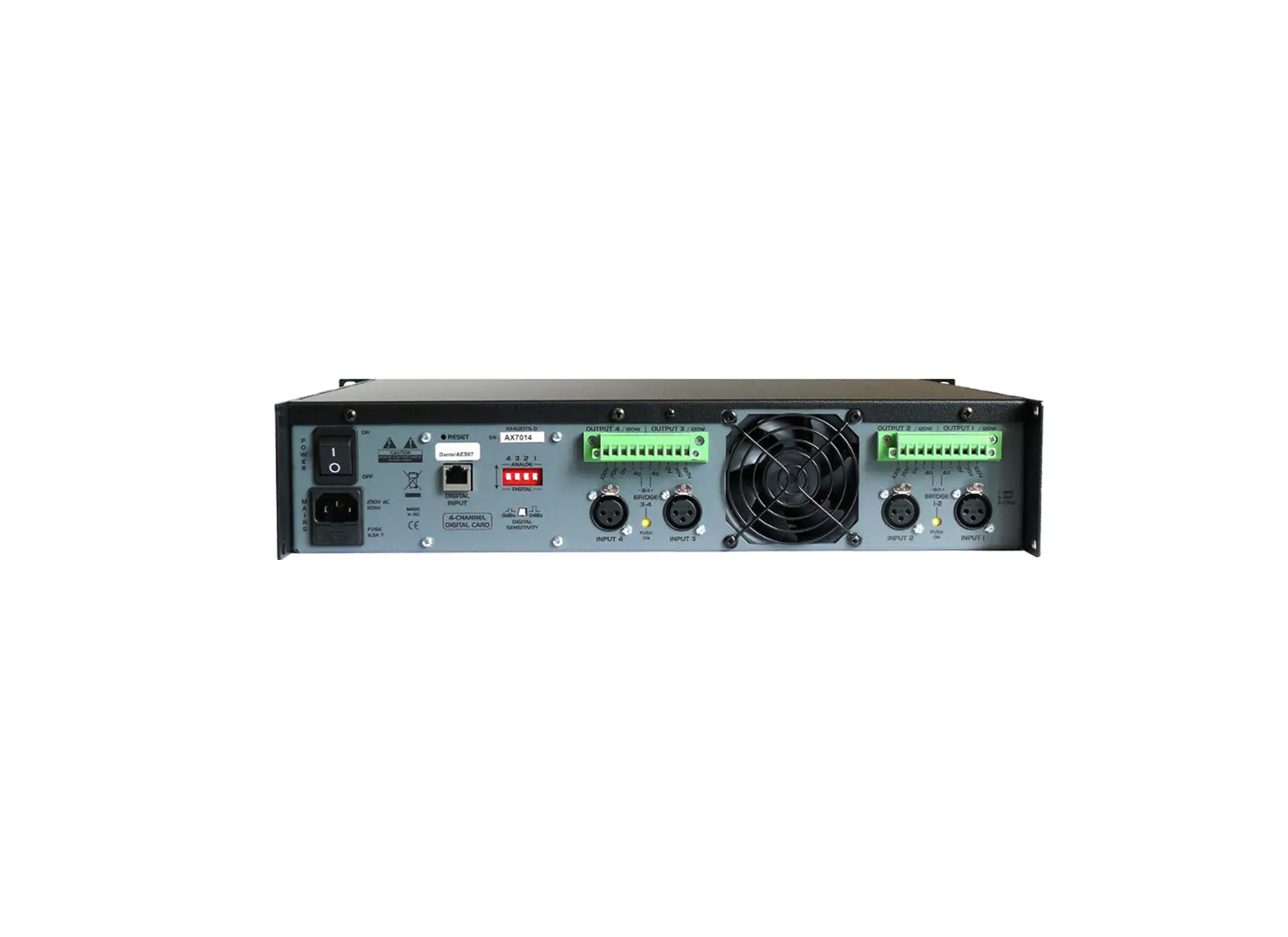 - Potenza di uscita: 4x120W RMS 70/100V e 4 Ohm. In modalità bridge 2x 234W a 8 ohm