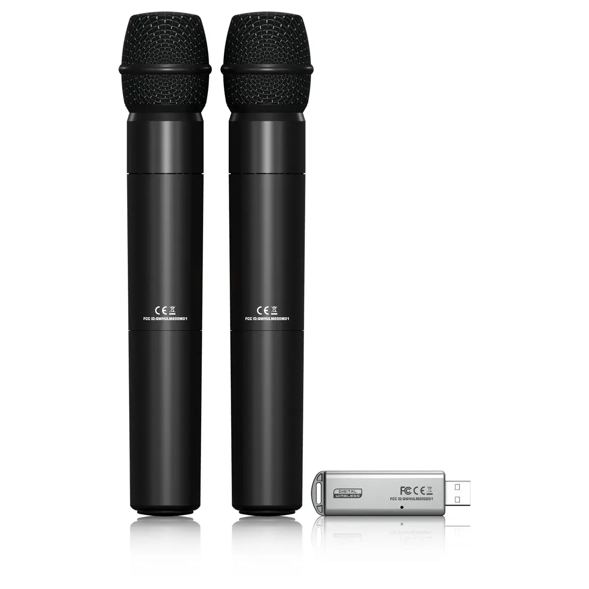 Coppia di microfoni wireless da palmo Behringer Ultralink ULM202USB, progettati per offrire una qualità audio superiore e praticità d'uso in applicazioni vocali.
