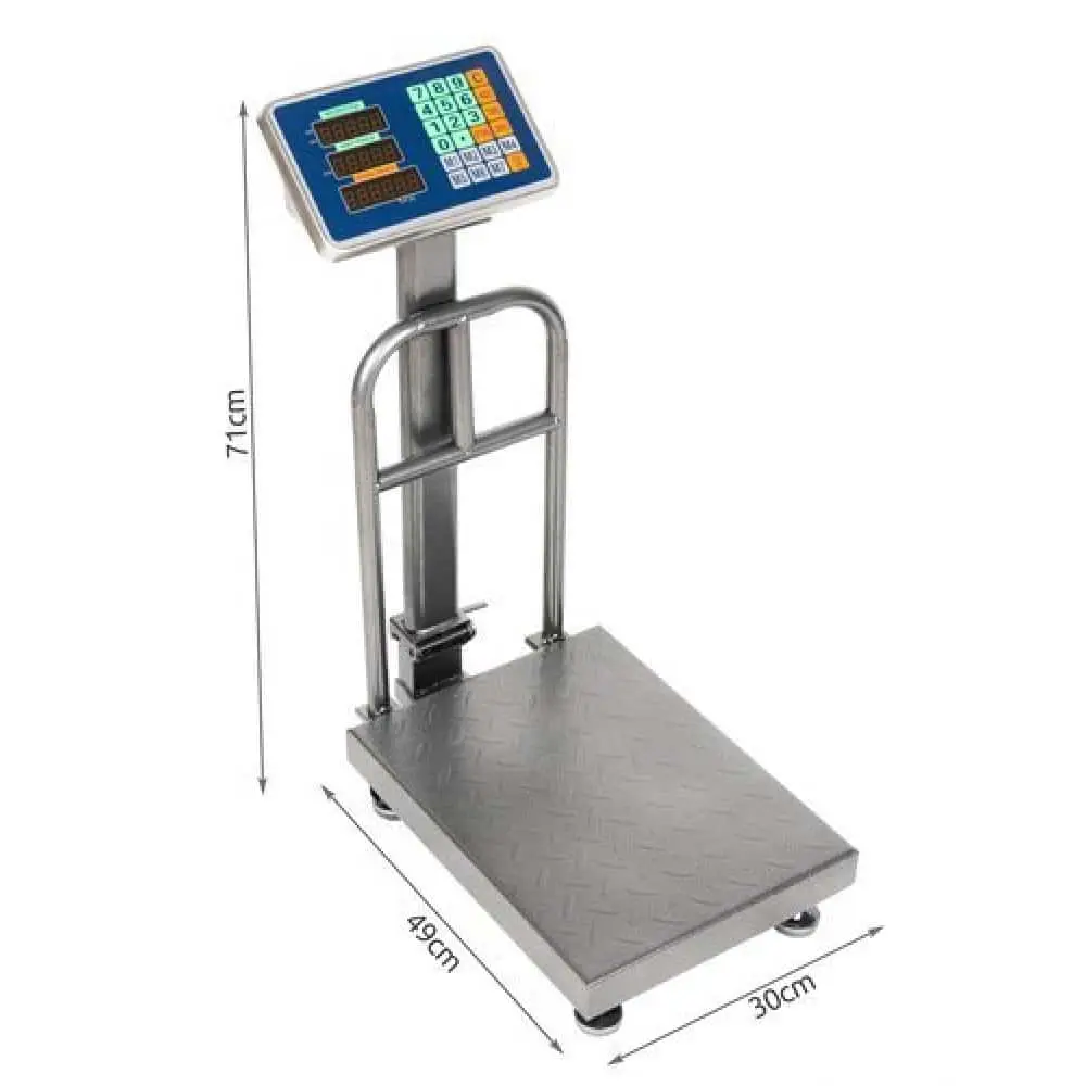 SPECIFICHE – piattaforma rinforzata: realizzata in lamiera di acciaio inox corrugata Programmazione prezzi Funzione tara Funzione di azzeramento Allarme sovraccarico Capacità di lavorare a temperatura: da 0 a 40 gradi carico massimo: fino a 150kg Precisione: 50g Alimentazione: rete / batteria (incorporata ) pratico pieghevole Espositore Braccio Piattaforma 40x30cm 3 display di grandi dimensioni Tastiera impermeabile Schienale per sostenere il prodotto Custodia in metallo Espositore Livellamento della bilancia regolando le gambe Batteria incorporata Caricatore da 4 V Idoneità sul campo Dimensioni (A / L / P): 71x30x49 cm Peso: 7 kg Peso nell’imballaggio: 8,03 kg.