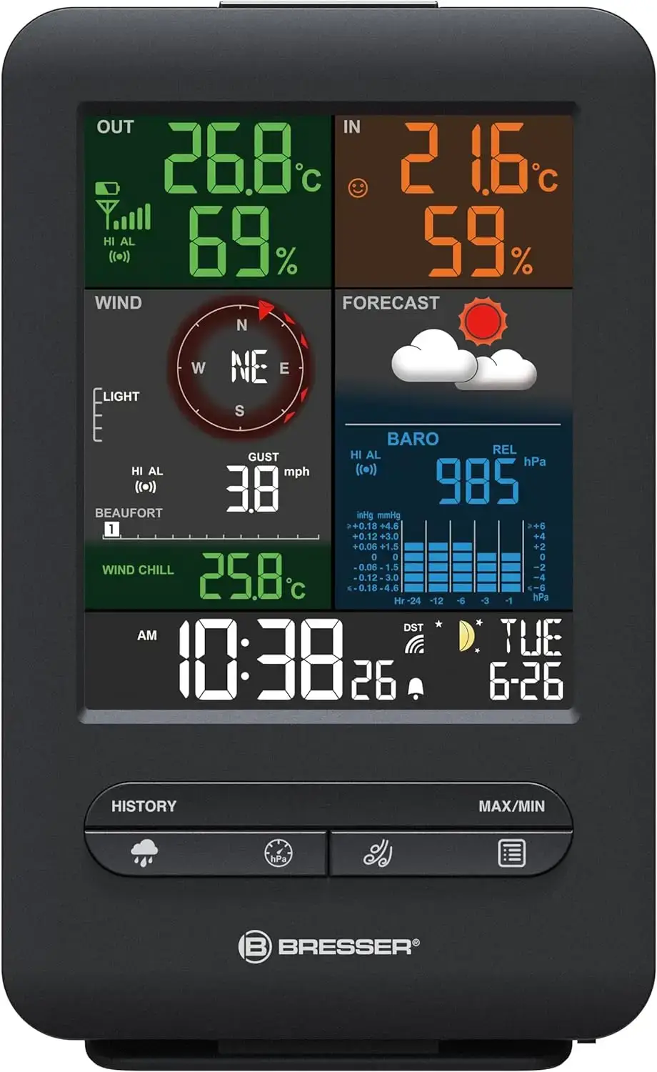 Comodo soprattutto in camera da letto: per aiutarti a dormire bene la sera, grazie al sensore ottico la luminosità del display si adatta automaticamente all’ambiente. La sveglia integrata con funzione Snooze fa invece il suo lavoro in modo affidabile al mattino. Nella stagione fredda, con l’allarme ghiaccio/gelo attivato, la sveglia suona 30 minuti prima se la temperatura scende sotto i -3 °C. Con il Centro Meteo BRESSER 5 in 1 Beaufort puoi ottenere un quadro ricco di colori su tempo e meteo.