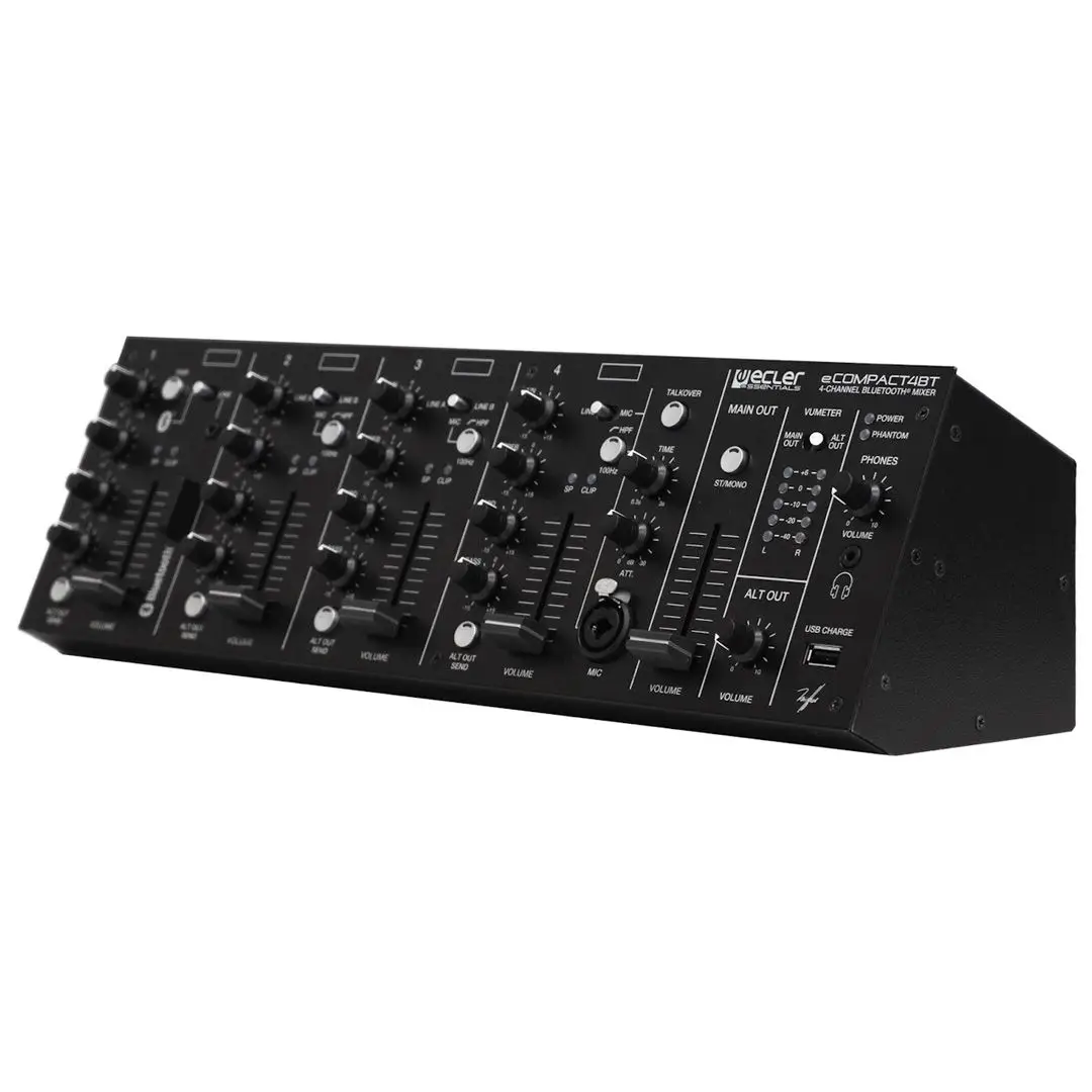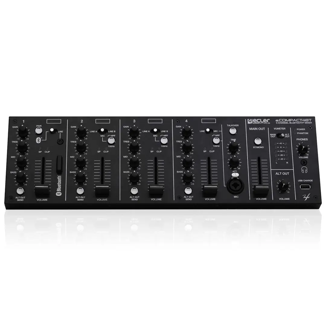 Tutti i canali hanno un EQ a 3 bande e possono essere indirizzati ad un’uscita alternativa usando il tasto “Alt Out Send“. Inoltre, ogni ingresso microfonico ha un filtro passa-alto commutabile e può essere alimentato con alimentazione phantom a 48 V tramite un selettore dedicato sul pannello posteriore. Sul lato di uscita è presente un’uscita principale simmetrica (XLR), un’uscita subwoofer con filtro passa-basso commutabile SUB OUT (XLR) e un’uscita alternativa ALT (connettore RCA). Altre caratteristiche, come la funzione talkover con parametri regolabili e l’uscita cuffie sul pannello di controllo frontale con connettore mini jack completano la gamma di funzioni di Ecler. eCompact4BT e’ stata tolta.