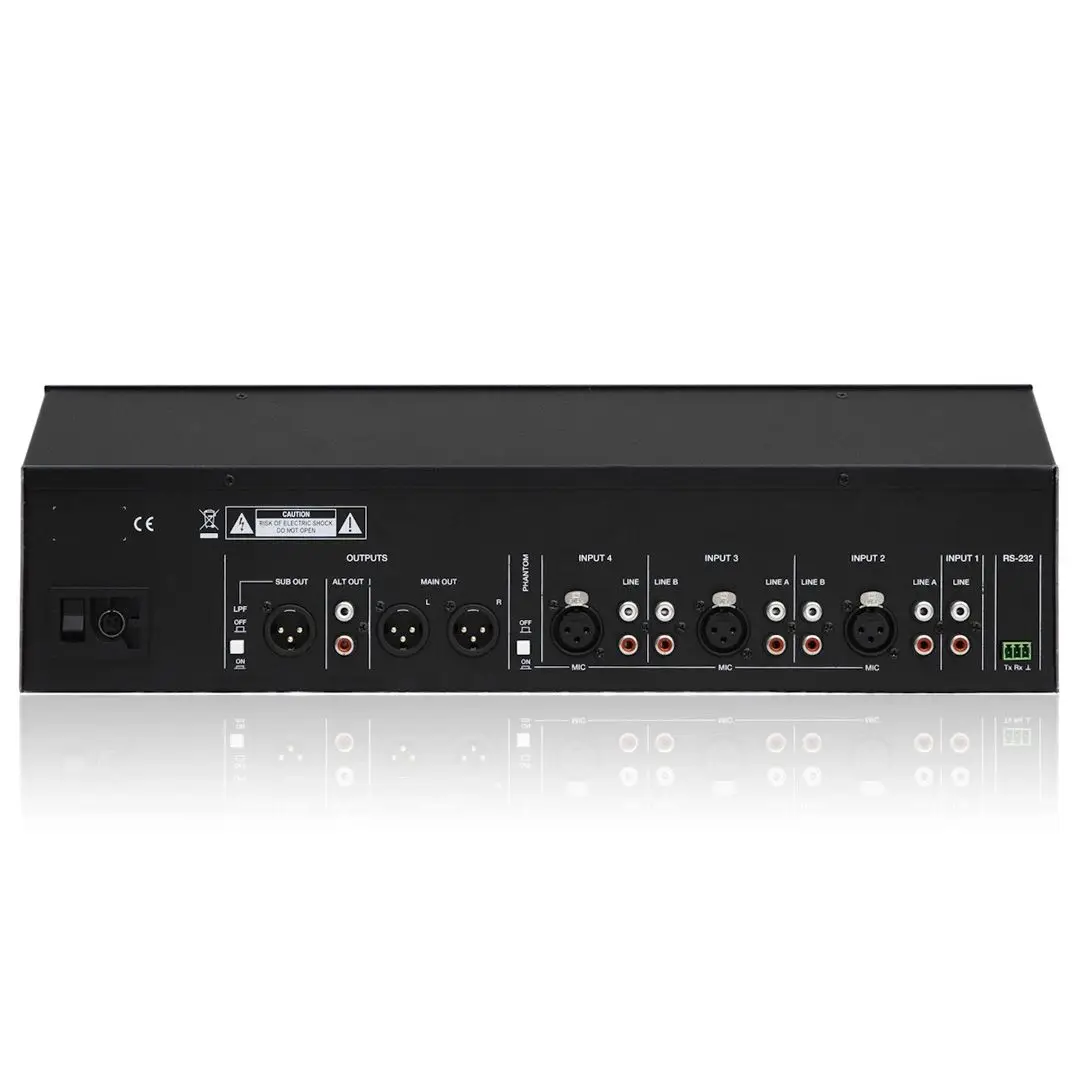 - Uscite: MAIN OUT (XLR con guadagno) + Stereo AUX OUT (Cinch con guadagno) + Mono SUB OUT (XLR con LPF selezionabile) + cuffie (mini jack con guadagno)