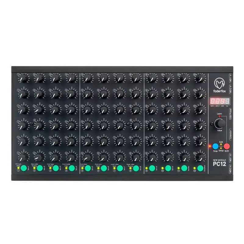 Faderfox PC12 è un controller universale per tutti i tipi di hardware e software controllabili tramite midi. Il dispositivo è dotato di 72 potenziometri rotanti standard gommati, 12 tasti con LED e un encoder a spinta. È possibile eseguire vari comandi midi come il cambio di controllo, l’attivazione/disattivazione delle note, il pitch bend, il post-touch e il cambio di programma. Inoltre, sono possibili assegnazioni rapide dei controlli ai comandi midi in arrivo. I fader e i potenziometri sono compatibili con tutti gli strumenti hardware e software e con le DAW, in quanto funzionano con la risoluzione standard di 7 bit. Il controller offre 30 impostazioni interne che possono essere utilizzate per memorizzare le proprie impostazioni individuali. Sono inoltre disponibili funzioni di backup e ripristino per tutti i setup tramite sysex dump. Grazie alle impostazioni di fabbrica, il PC12 non richiede alcuna configurazione aggiuntiva per funzionare con musica e software video midi-learnable subito. È incluso anche uno speciale script per le superfici di controllo di Ableton Live 8/9 con tutte le mappature necessarie per il controllo simultaneo di 12 tracce. Oltre a questo, è possibile collegare in cascata diversi dispositivi di NUOVA MODULO tramite connessioni dedicate sul lato destro. Inoltre, sono disponibili 4 porte MIDI e una porta USB con numerose varianti di routing.