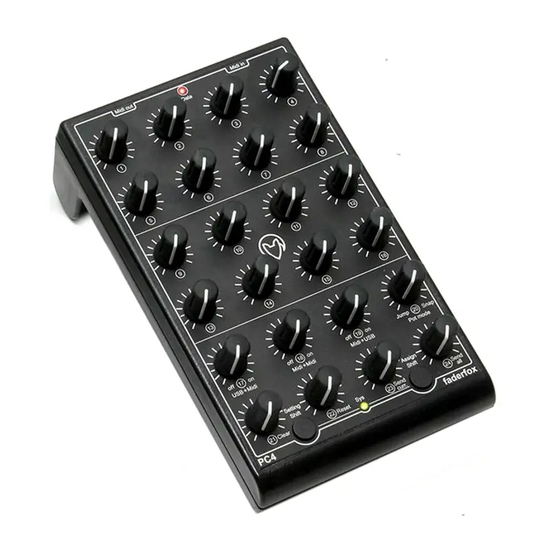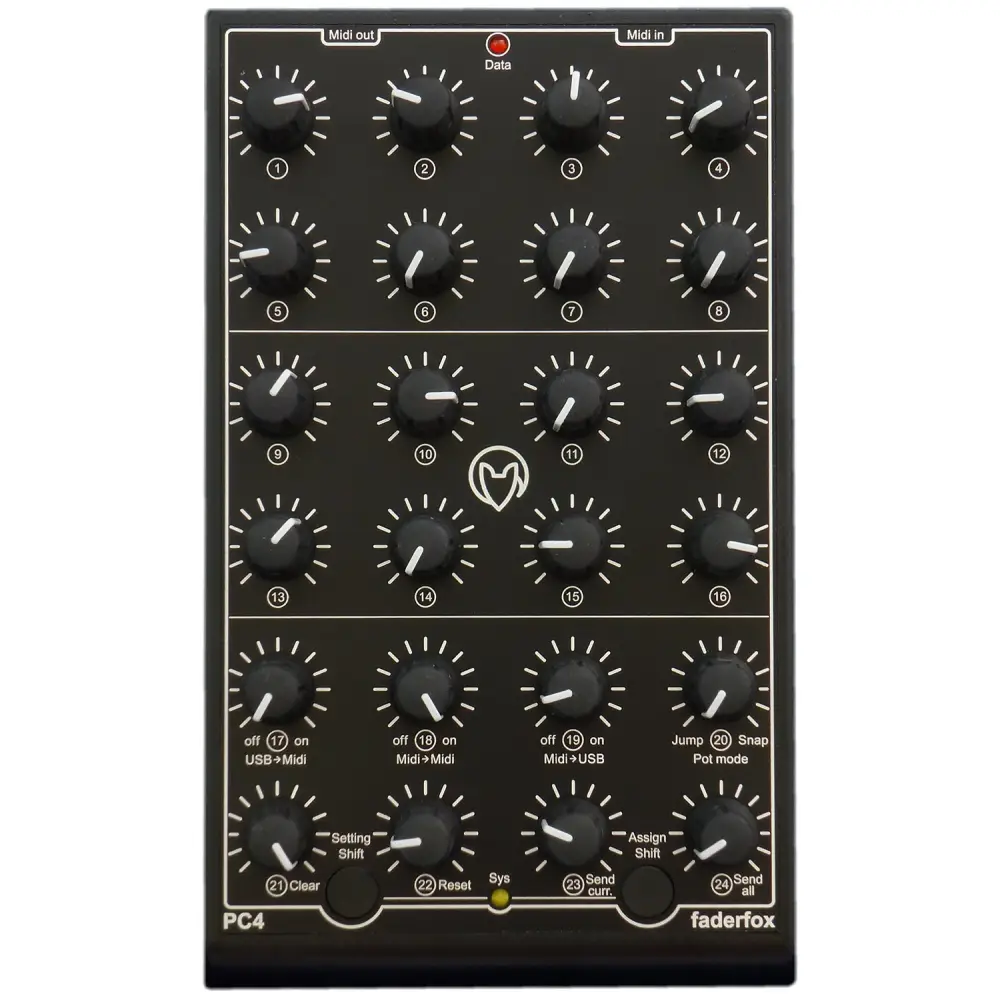 Il Faderfox PC4 è un controller universale per tutti i tipi di hardware e software controllabili via midi. Il controller è dotato di 24 potenziometri rotativi standard con manopole gommate, disposti in una matrice 4 x 6. Sono possibili vari comandi midi come control-change, pitch-bend e program-change. I potenziometri funzionano con una risoluzione standard di 7 bit e sono compatibili con tutti gli strumenti hardware e software e con le DAW. 16 setup interni sono utilizzati per memorizzare le proprie impostazioni individuali. Le impostazioni di fabbrica del PC4 sono perfette per il controllo istantaneo di software musicali e video appresi via midi.