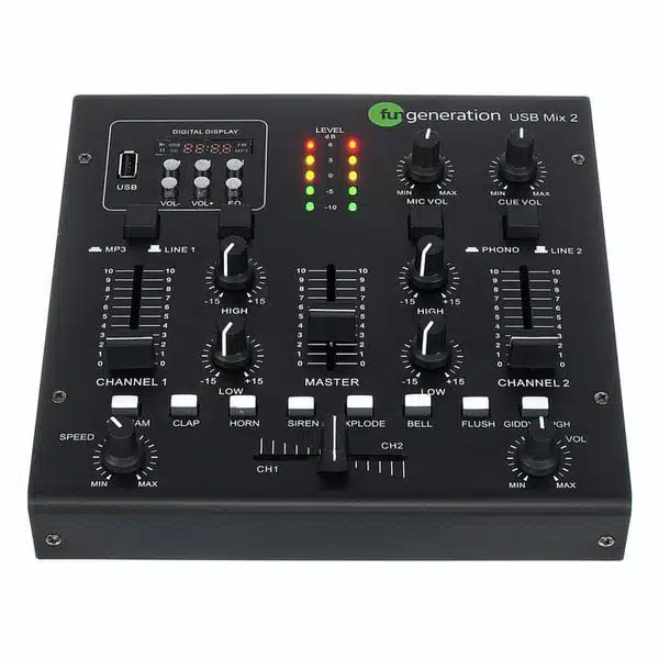 Mixer a 2 canali con lettore USB e FX, ideale per DJ e performance musicali.