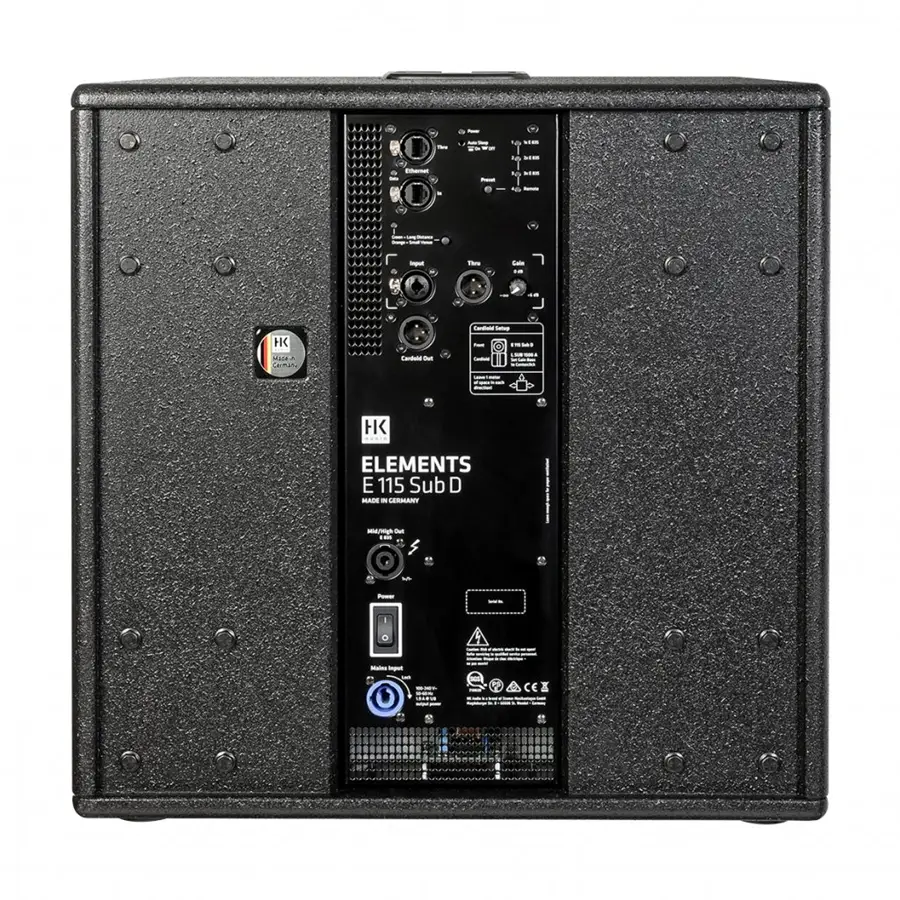 Il cuore dell’ELEMENT E 115 Sub D, tuttavia, è un controller digitale di ultima generazione, che consente un filtraggio notevolmente più efficiente dei componenti dell’altoparlante, perfezionando così in modo impressionante le qualità audio delle collaudate unità E 835 ed E 435 medio-alte ancora una volta. Inoltre, la funzionalità dei bassi cardioidi è tanto facile da usare quanto efficace (se integrata con un secondo subwoofer). Particolarmente degna di nota è la capacità di rete e il controllo remoto tramite il software HK Audio DSP CONTROL per MacOS o Windows.