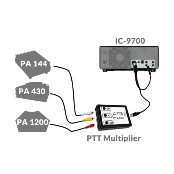 Il moltiplicatore PTT IC-9700 consente di connettere amplificatori di potenza alla radio Icom IC-9700, garantendo un controllo semplice e automatico per tre bande di frequenza.