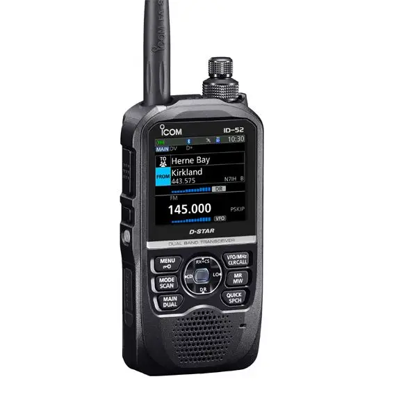 ID52E Icom nuovo portatile duobanda VHF/UHF con possibilità di trasmissioni digitali D-Star di serie e display da 2,3? a colori. Nuovo apparato con Bluetooth e GPS integrati e grado di protezione IPX7. Il ricevitore Gps entrocontenuto mostra la vostra posizione ed altezza ed è in grado di inviarla ai vostri corrispondenti, inoltre la funzione Log consente di tracciare i vostri movimenti. L’alloggiamento per una memoria del tipo micro-SD (opzionale) consente l’archiviazione dei dati Gps, di registrare l’audio delle vostre comunicazioni e memorizzare il contenuto dei canali impostati. Ricevitore estremamente flessibile ed in grado di operare in dualwatch anche sulla stessa banda V/V-U/U-V/U-DV/DV, gamma di ricezione estesa. Tasti direzionali ed i pulsanti di scelta rapida semplificano notevolmente le operazioni. E’ stato poi semplificato anche l’accesso alla rete digitale D-Star. 1304 memorie totali comprese quelle dedicate ai limiti di scansione, ai canali di chiamata e quelle dedicate ai ripetitori D-Star. Step selezionabili fra 5, 6.25, 10, 12.5, 15, 20, 25, 30, 50, 100, 125 e 200 KHz. Potenza di uscita 5W, varie funzioni di scansione programmabili, toni subaudio CTCSS e digitali DTCS, DTMF con 16 memorie dedicate, economizzatore di consumi, autospegnimento, funzione orologio, protocollo VI-V per controllo remoto. Dimensioni estremamente contenute.