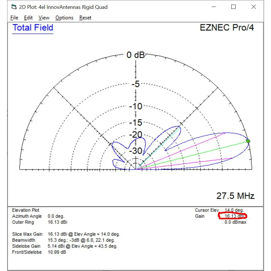 Il guadagno dell’antenna è di 16.13 dBi dal suolo.