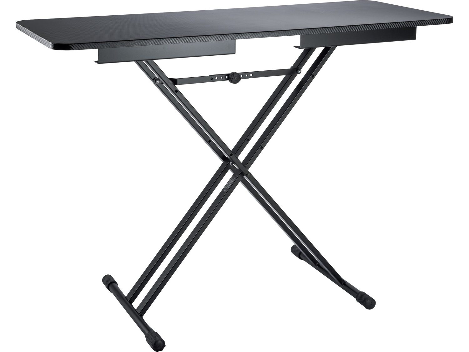 Il versatile set è composto dal supporto per tastiera 18963, famoso in tutto il mondo, e dall’attraente piano del tavolo 18905 con rivestimento effetto carbonio. Il supporto per tastiera a doppio rinforzo con livellamento del pavimento integrato garantisce un supporto stabile e sicuro. Il piano del tavolo con dimensioni 450 x 1.100 mm offre spazio sufficiente per controller, mixer, laptop, sintetizzatori, ecc. Il montaggio è facile da realizzare. Il robusto piano del tavolo in MDF viene semplicemente fatto scorrere sul supporto per tastiera e centrato. Non sono necessari ulteriori fissaggi.