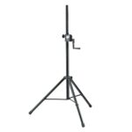 Un supporto per altoparlanti in acciaio di alta qualità con morsetti in plastica per uso professionale. Regolazione in altezza infinitamente variabile con una manovella e un sistema a pulsante che impedisce un movimento inverso incontrollato. C’è una vite di bloccaggio aggiuntiva per una maggiore sicurezza. Tubo di prolunga diametro 35 mm, adatto per altoparlanti e traverse di illuminazione con connettore filettato M10 integrato.