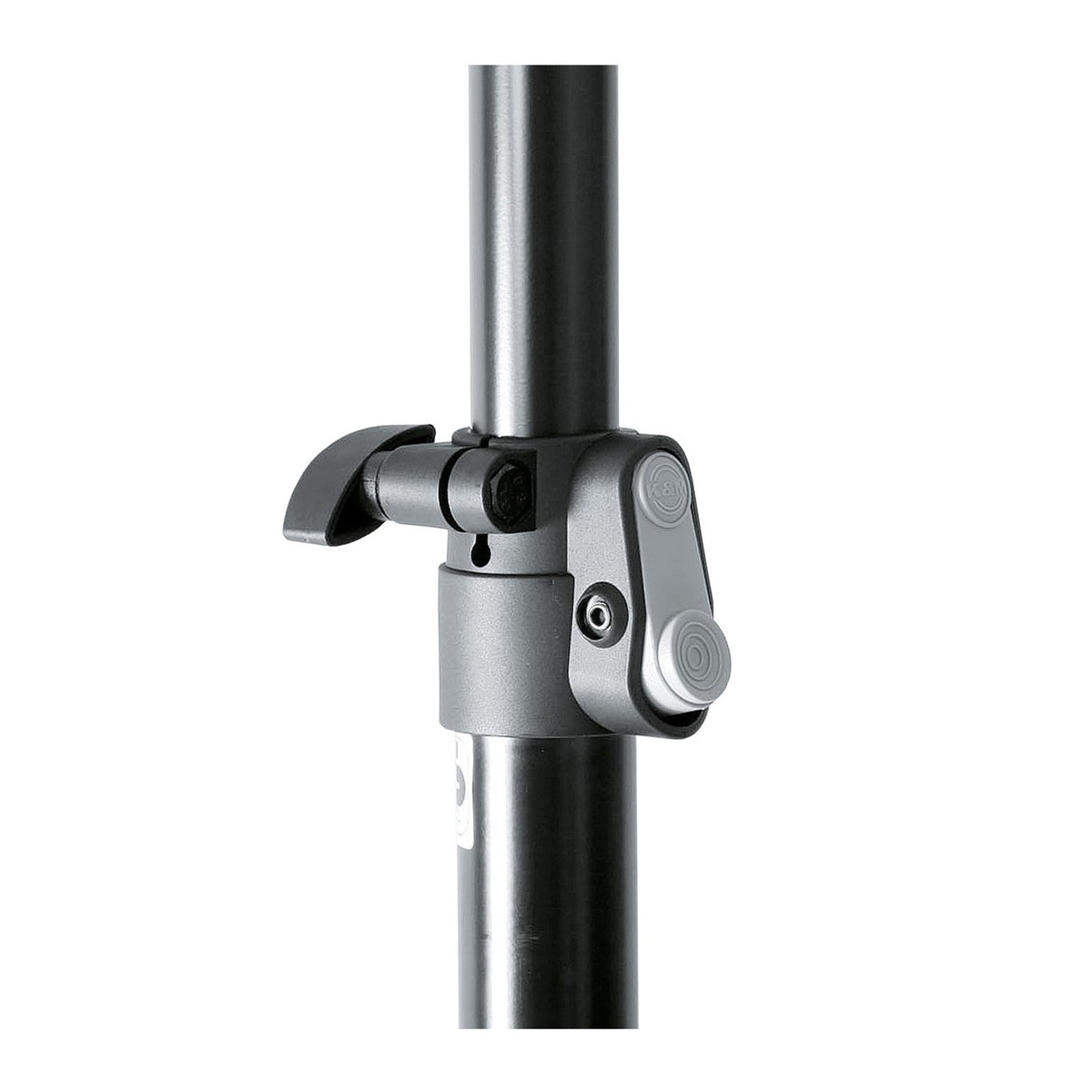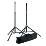 Due supporti per altoparlanti facili da trasportare realizzati in alluminio di alta qualità in una custodia per il trasporto. I raccordi rinforzati con fibra di vetro e un morsetto compatto con un sistema a pulsante brevettato consentono una regolazione dell’altezza intuitiva e garantiscono un supporto stabile per gli altoparlanti. La struttura delle gambe si regola tramite una leva di bloccaggio facile da usare.