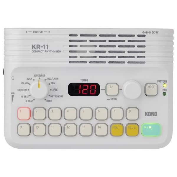 Korg KR-11; computer a tamburo compatti; 126 pattern ritmici + 14 posizioni di memoria utente; modello modificabile; metronomo; 16 pad sensibili alla velocità; 2 connessioni per interruttore a pedale per transizioni di pattern, fill-in e avvio e arresto della riproduzione del ritmo; Funzione Tap-Tempo; sistema di altoparlanti integrato con tecnologia Acoustage Bass; Display a LED; alimentazione tramite alimentatore opzionale o quattro batterie AA (non incluse); connessioni: uscita linea stereo/cuffie mini jack da 3,5 mm, 2 ingressi per interruttore a pedale jack da 6,3 mm; Dimensioni: 160 x 115 x 44 mm; Peso: 279 g