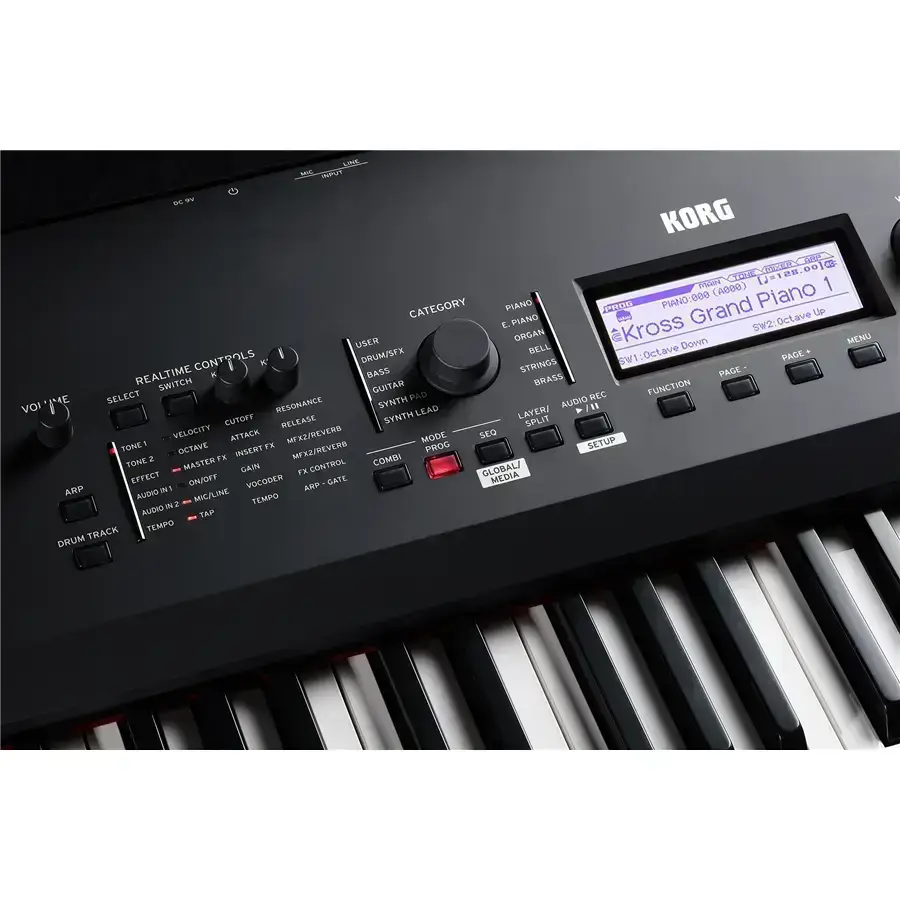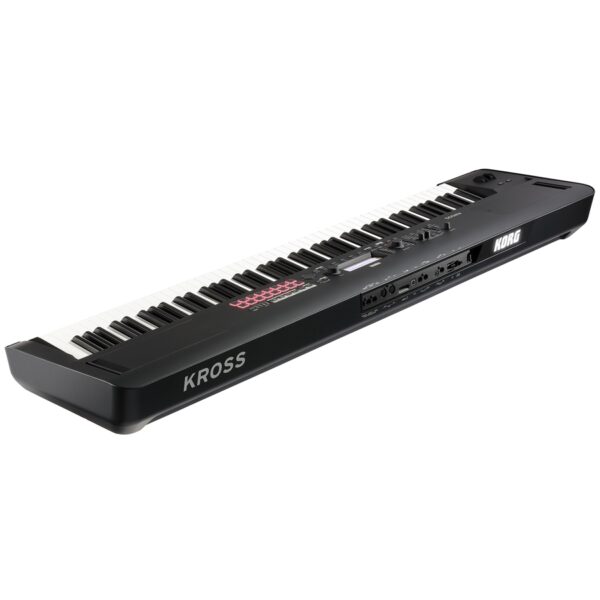 KORG KROSS 2 -88 MB workstation leggera, funzionante anche a batterie, concepita per operare in mobilità, con tastiera pesata 88 Tasti NH (Natural Weighted Hammer Action) sensibile alla Velocity, più di 1.000 Program/Combi Preset, funzioni Quick Layer/Split, 128 memorie FAVORITE per i suoni preferiti, Master/Insert FX: 134 tipi, 128 MB User Sample RAM, 16 Sample Pad, 14 Secondi ognuno, Sample Editing, Sequencer, Step Sequencer, Drum Track, Arpeggiatore, interfaccia utente intuitiva e veloce, porta USB/MIDI & Audio, Slot per SD Card.