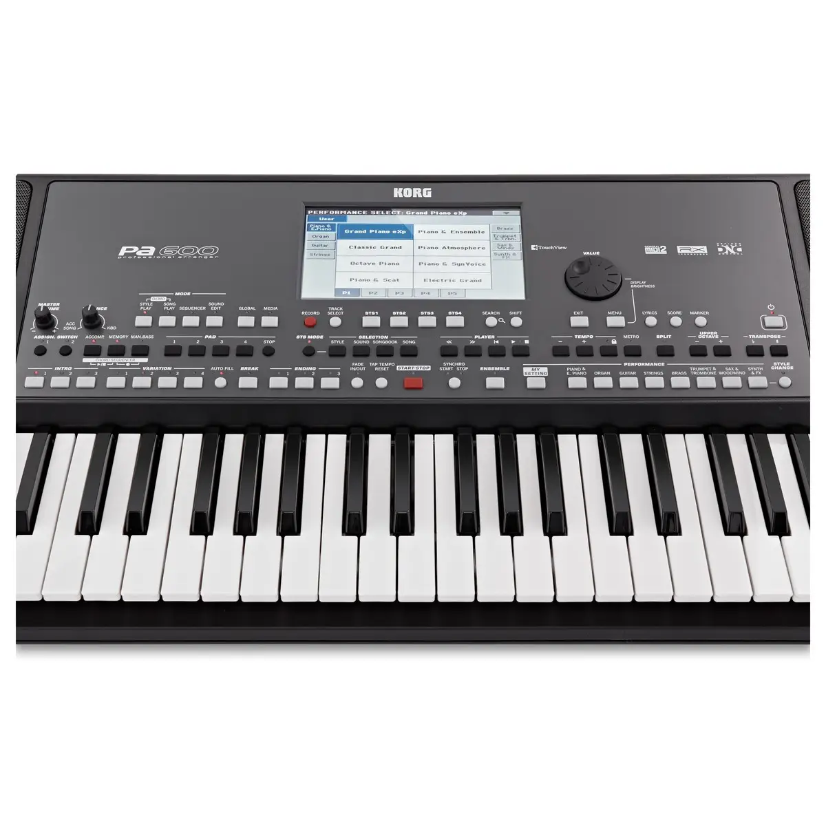 - Controlli generali: Master, Volume di bilanciamento in tempo reale/Acc/Seq, Ensemble, trasposizione in ottava, trasposizione master, dissolvenza in/out, blocco del tempo, cambio di stile – Scala araba a quarti di tono, scala utente memorizzata all’interno di Performance/STS, ricerca, testo, punteggio, Maker, quadrante, tempo, metronomo, split