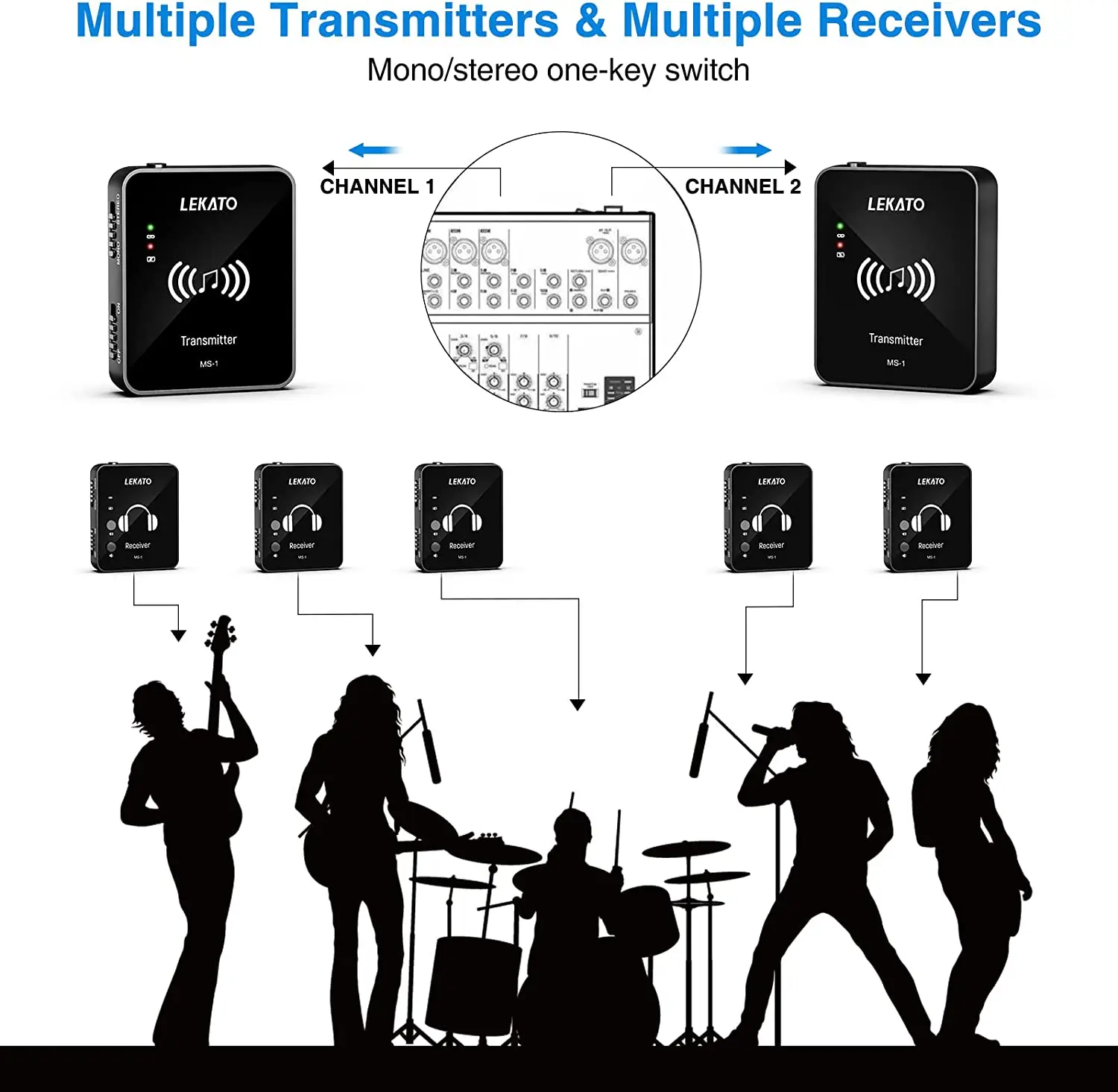 - ?System IEM wireless da 2,4 GHz?Il system di monitoraggio intrauricolare wireless LEKATO MS-1 adotta la trasmissione wireless 2.4G, con qualità del suono senza perdita, basso rumore/bassa latenza. Un tasto per cambiare l’ingresso mono/stereo, fornendo una risposta in frequenza fluida con qualsiasi auricolare. La distanza di trasmissione effettiva è di 90 piedi.