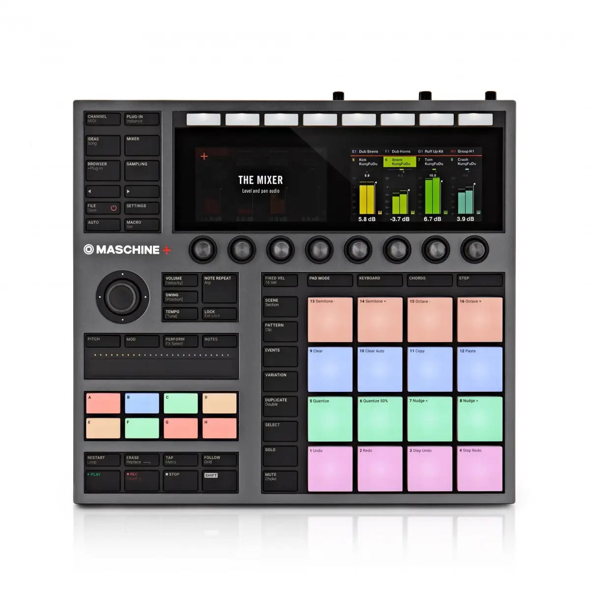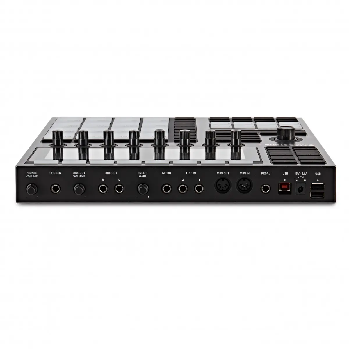 - Emblematic Maschine Workflow, con 16 pad retroilluminati sensibili alla velocità, plug-in ed effetti esclusivi, swing, pad, ripetizione di note, step-sequencer e funzioni di emulazione del campionatore vintage