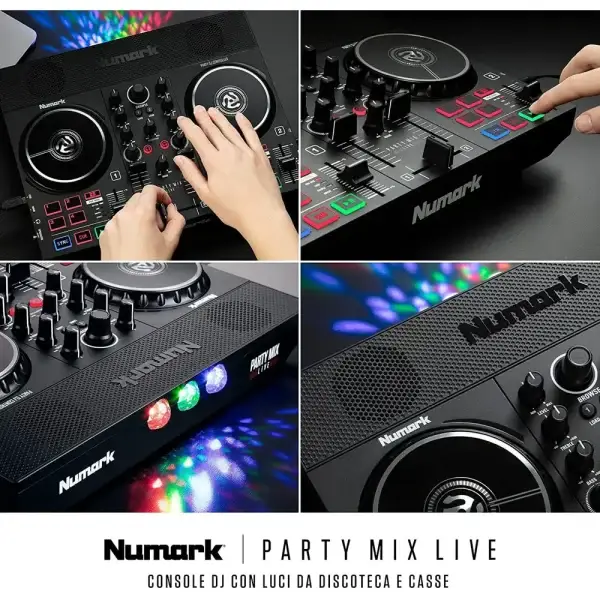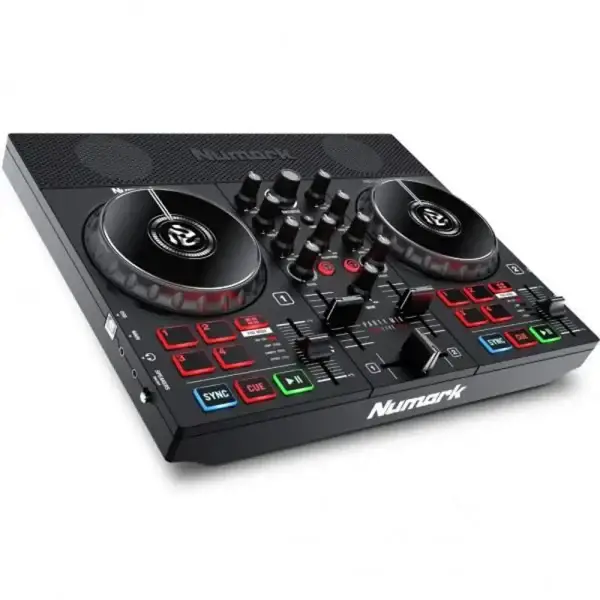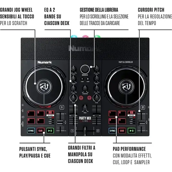 Il Numark Party Mix Live è un controller DJ a 2 canali con scheda audio integrata e altoparlanti commutabili, ideale per le feste.