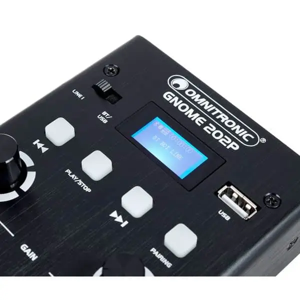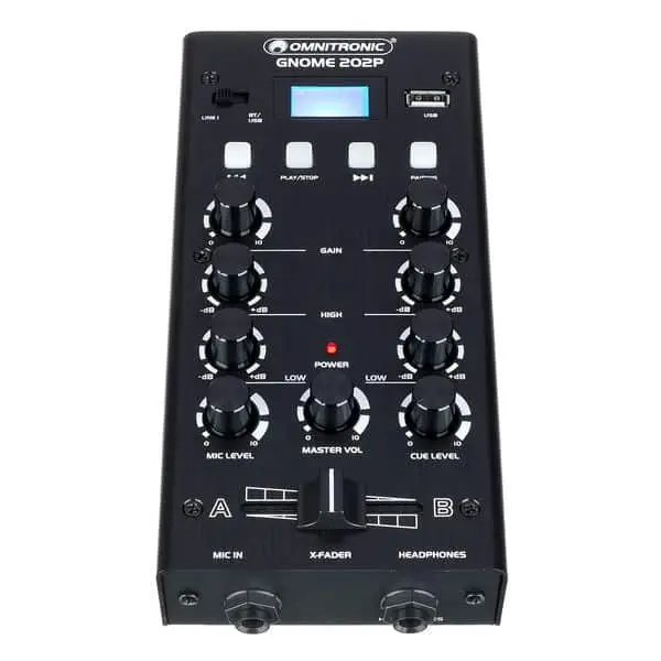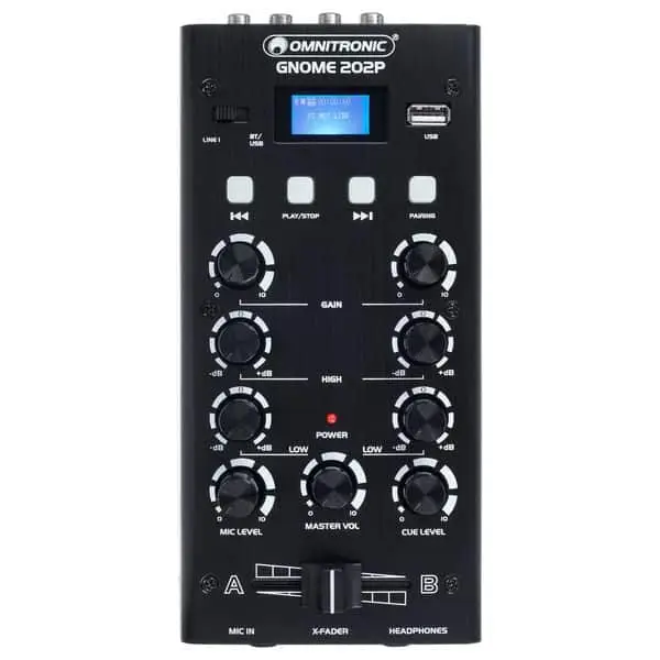 Mixer DJ compatto con Bluetooth e MP3 player, ideale per i DJ in movimento.