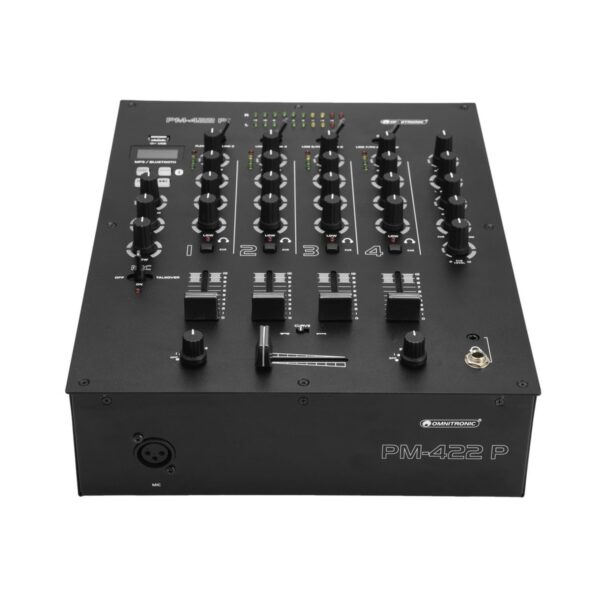 - 4 canali di ingresso con controllo del guadagno, misuratore di livello a LED, equalizzatore a 3 bande, pulsante cue e fader dei canali