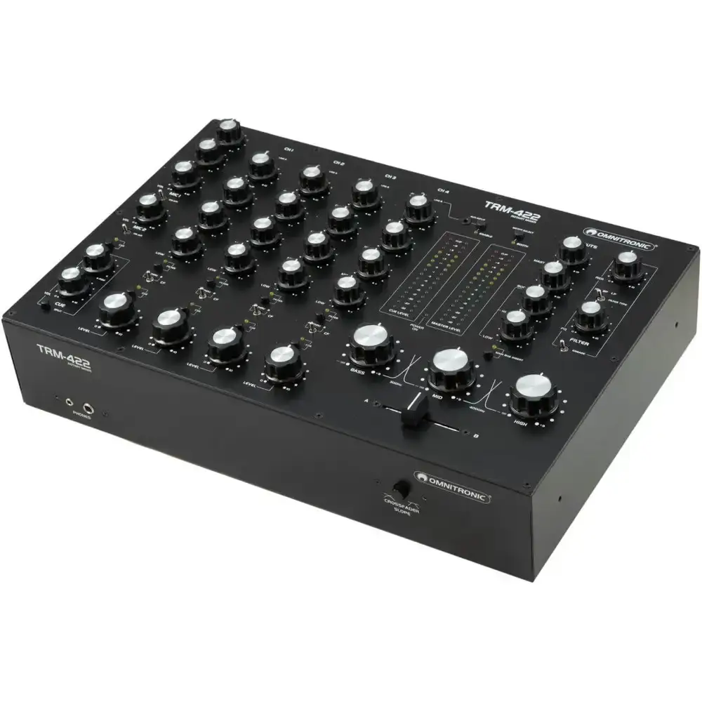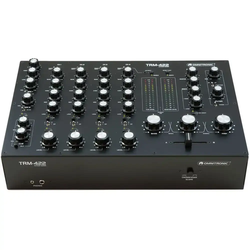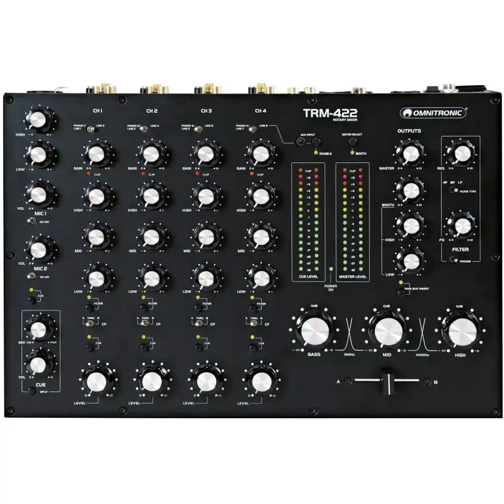 L’Omnitronic TRM-422 è un mixer rotativo professionale a 4 canali con caratteristiche sonore fantastiche. Oltre ai popolari modelli TRM-202 MK3 e TRM-402, Omnitronic presenta ora il TRM-422, una variante completamente nuova della loro divisione mixer rotativo. Il mixer da tavolo per DJ è dotato di potenziometri rotativi ALPS di alta qualità (Blue Velvet RK27), che garantiscono una lunga durata. Come i suoi predecessori, il compatto TRM-422 ha un isolatore di frequenza a 3 bande integrato che utilizza le caratteristiche di uccisione per cancellare completamente i bassi, i medi e gli alti, aprendo molte possibilità creative. Inoltre, ogni canale ha un controllo di guadagno, un equalizzatore a 3 bande, un interruttore phono/line aggiuntivo e l’assegnazione dei singoli canali al filtro integrato o al crossfader. Come highlight Omnitronic ha dato il TRM-422 ancora quattro uscite dirette, per l’integrazione di sistemi time code / DVS, che semplifica il collegamento durante il funzionamento estremamente! Due misuratori di livello a LED stereo a 16 cifre assicurano che il segnale della cuffia e del master sia sempre in vista per evitare il sovraccarico del segnale. Con il suo suono notevole, la lavorazione di alta qualità e il layout intuitivo, l’Omnitronic TRM-422 è un mixer di prima classe Rotary .