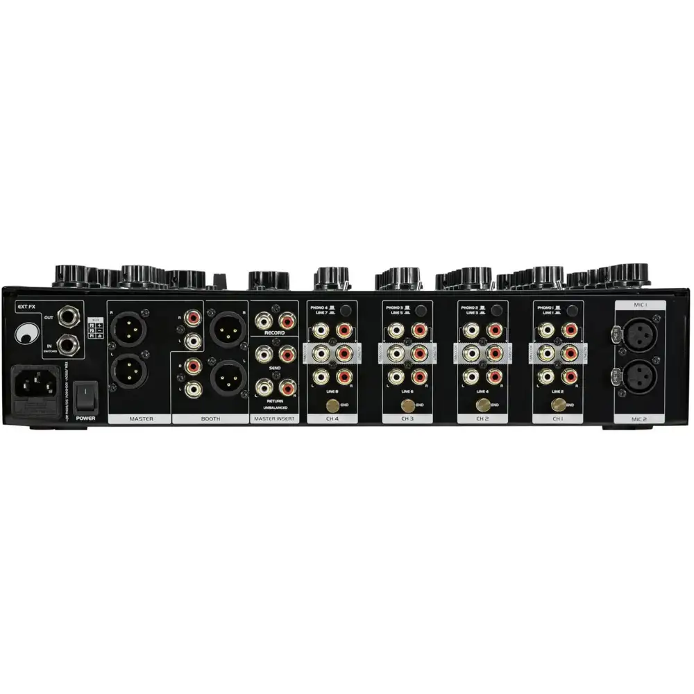 - 4 canali stereo con gain, EQ a 3 bande, clip LED e commutazione phono/linea