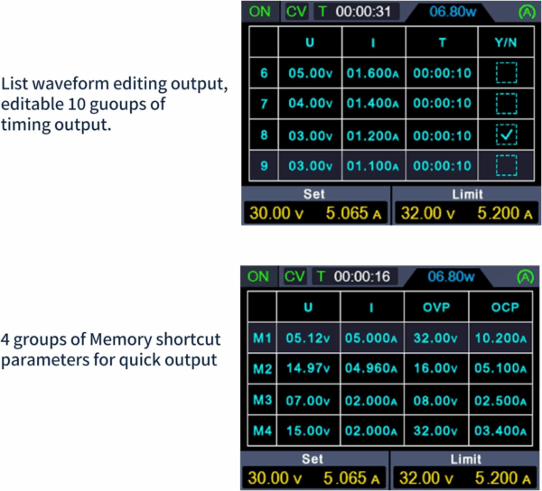- Alimentazione programmabile: pulsante di memoria. È possibile memorizzare 4 set di parametri di canale (da M1 a M4) e trasmetterli rapidamente. Elenca le impostazioni di output della forma d’onda: è possibile modificare e ottenere forme d’onda di output, il set di forme d’onda contiene 10 elementi modificabili. I parametri modificabili per ciascun punto includono la tensione di uscita, la corrente di uscita, la durata della forma d’onda e se il punto è selezionato.