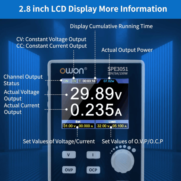 - Calcolo automatico della potenza: calcola in modo intelligente la tensione di uscita e la corrente in potenza e visualizza il valore sull’ampio schermo. Caricamento automatico del punto decimale e indicatori di funzione di visualizzazione della tensione a LED a 4 cifre. elettricità e potenza; La tastiera può essere bloccata per evitare operazioni errate.