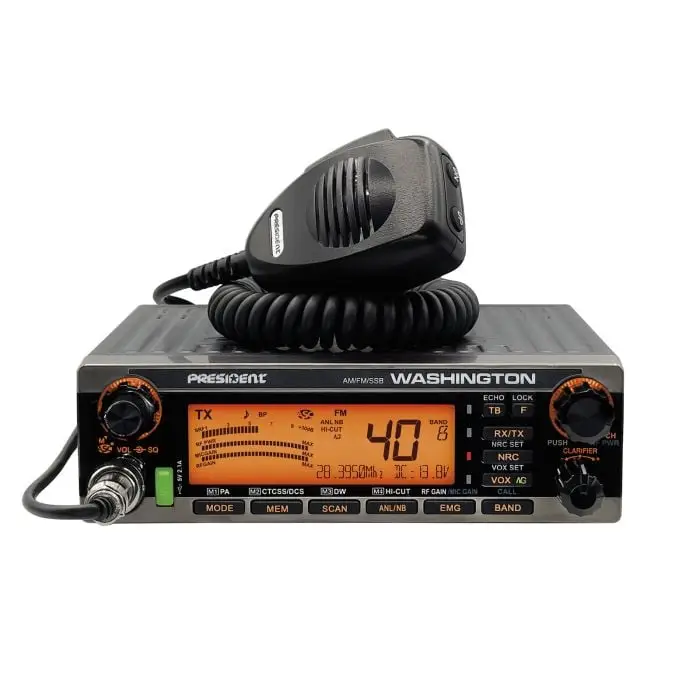 Il President Washington II è un versatilissimo ricetrasmettitore mobile per radioamatori, coprendo le bande dei 10m e 12m con potenza regolabile e diverse modalità di trasmissione.