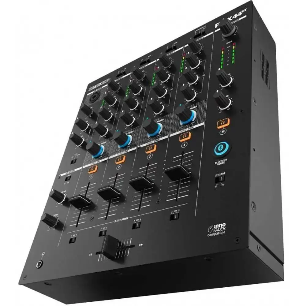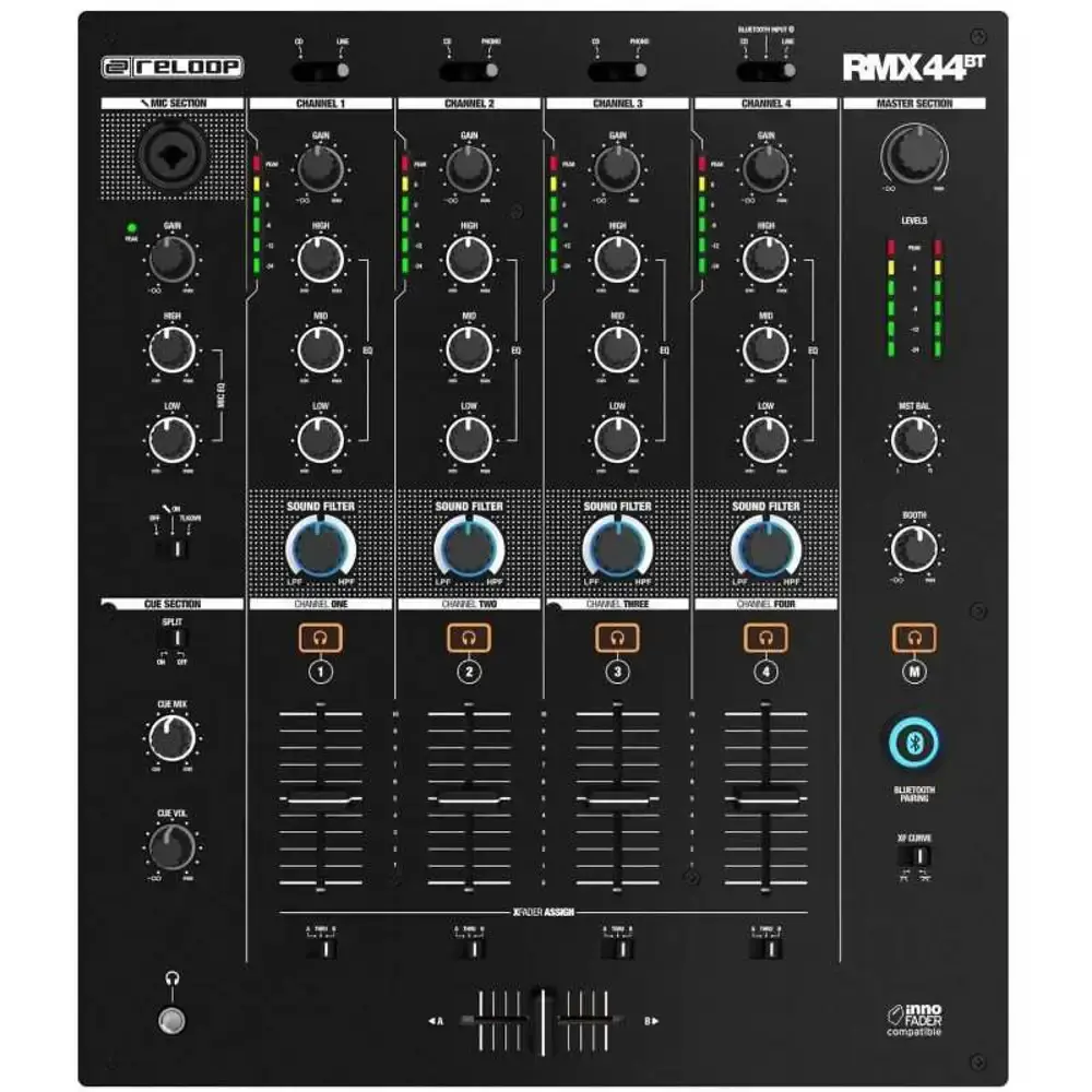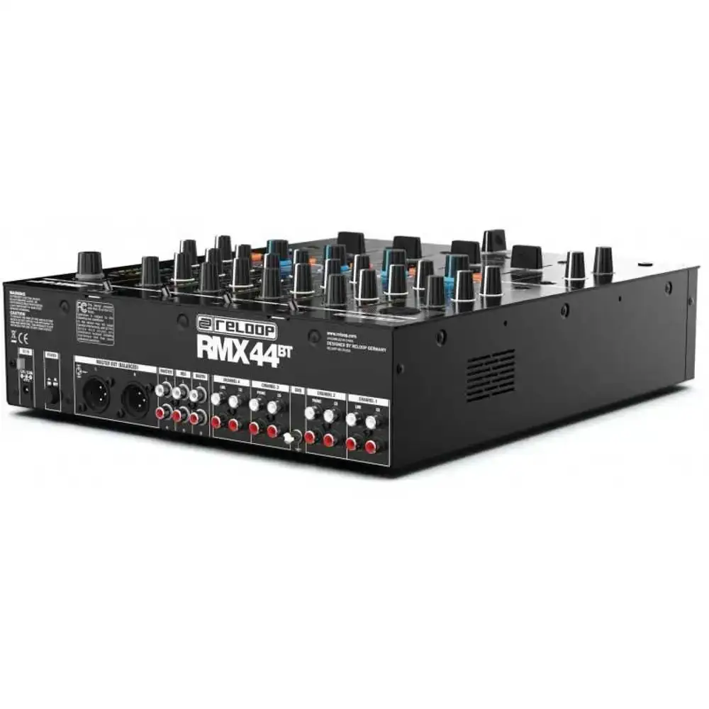 L’ingresso Bluetooth Smart Connectivity con funzione Cue consente di collegare rapidamente e facilmente smartphone, laptop e tablet al mixer. Sono disponibili un totale di nove ingressi, quattro uscite, incluse le uscite bilanciate (XLR) e sbilanciate (RCA), un EQ a 3 bande, un filtro bipolare con LPF e HPF per canale e una sezione microfonica con EQ a 2 bande e talkover “ Active Ducking Technology”. Inoltre, il Reloop – RMX-44 BT RMX Innofader RMX compatibile e offre la possibilità di regolare la curva del crossfader. Il corpo in metallo così come la superficie di alta qualità in nero profondo metallico rendono il Reloop Bluetooth DJ Clubmixer estremamente resistente.