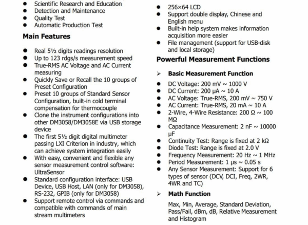 DM3058E è un economico multimetro digitale a 5½ cifre. È progettato per soddisfare requisiti di test di elevata precisione, multifunzionalità e misurazione automatica. Integra funzioni di misurazione automatica, multiple trasformazioni matematiche e misurazioni di sensori arbitrarie. Dispone di interfacce USB e RS232.