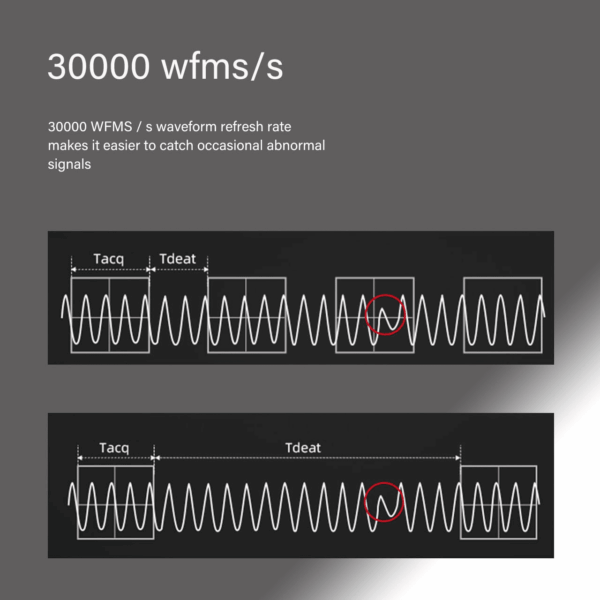 La frequenza di aggiornamento della forma d’onda di 30000 WFMS/s facilita l’individuazione di segnali anomali occasionali.