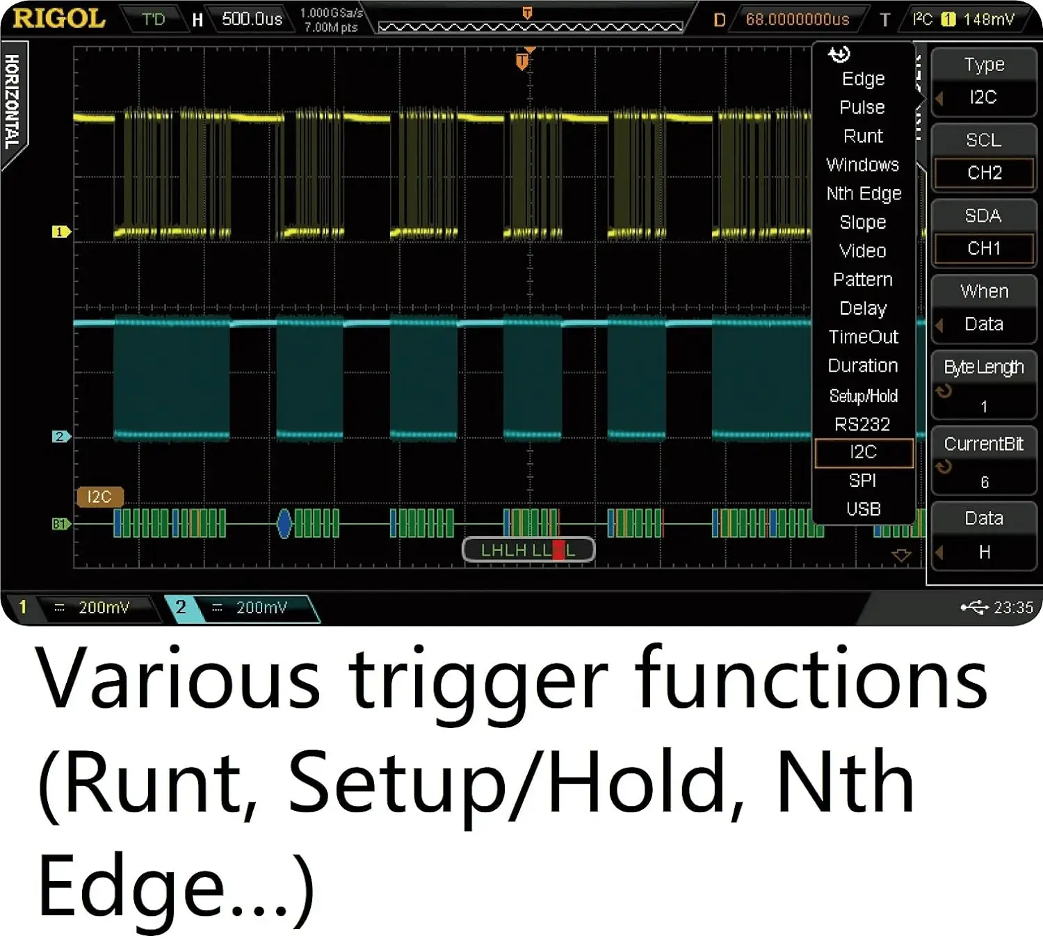 - La frequenza di campionamento in tempo reale 2 GSa/s e la memoria fino a 56 Mpts possono supportare lo zoom in una parte selezionata delle forme d’onda acquisite per ottenere maggiori dettagli e scorrere all’interno dei punti di misurazione. Vari trigger standard e decodifica bus. Trigger avanzato: trigger di Windows, trigger Nth edge, ecc. Decodifica: parallela, RS232, I2C, SPI, CAN