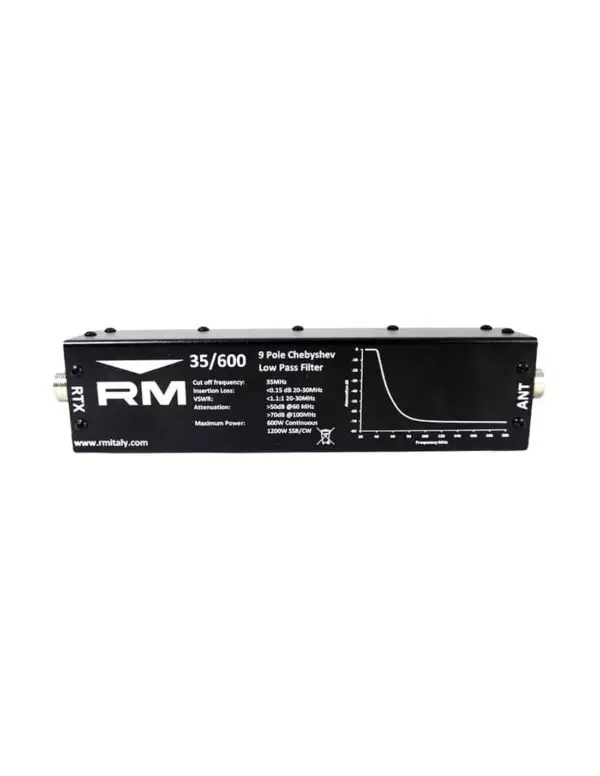 Il filtro passa-basso RM Italy LPF35-600 è progettato per sopprimere le armoniche e le interferenze nei dispositivi radio e TV.