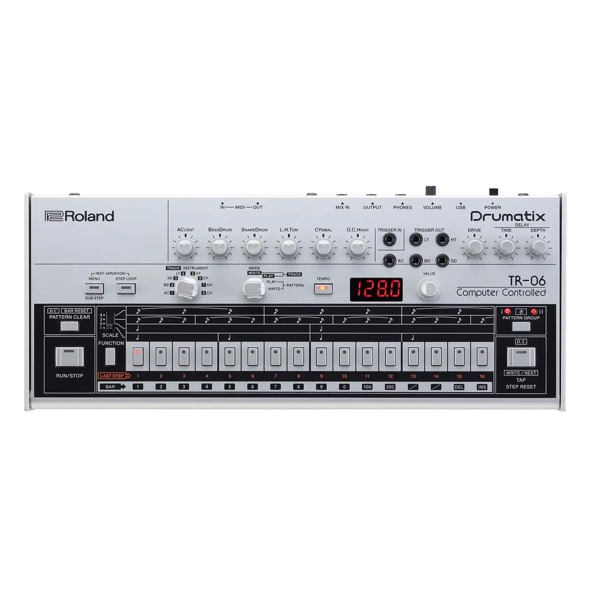 Roland presenta con il TR-06 Drumatix loro riproduzione digitale reinterpretazione del classico drum computer TR-606 (1982-1984) e allo stesso tempo la “sorella minore” del TR-08. Una volta era la TR-606 che dovrebbe fornire l’accompagnamento ritmico al Bassline TB-303 nella stessa custodia, Roland ha elegantemente riconfezionato questo con la TR-06 nella serie Boutique. Il suono puristico, analogico, che in questo caso è implementato digitalmente con la moderna tecnologia Roland ACB tecnologia, è adatto allora come oggi soprattutto per le tracce electro e naturalmente tutto ciò che ha bisogno di pressione o semplicemente per completare un’altra drum machine. La generazione del suono è personalizzabile tramite il menu e i singoli suoni possono anche essere scambiati. Sette strumenti e Accent sono programmabili. Grancassa, rullante e Cymbal hanno un proprio controllo di volume, Toms e Hihats sono impostati in coppia.