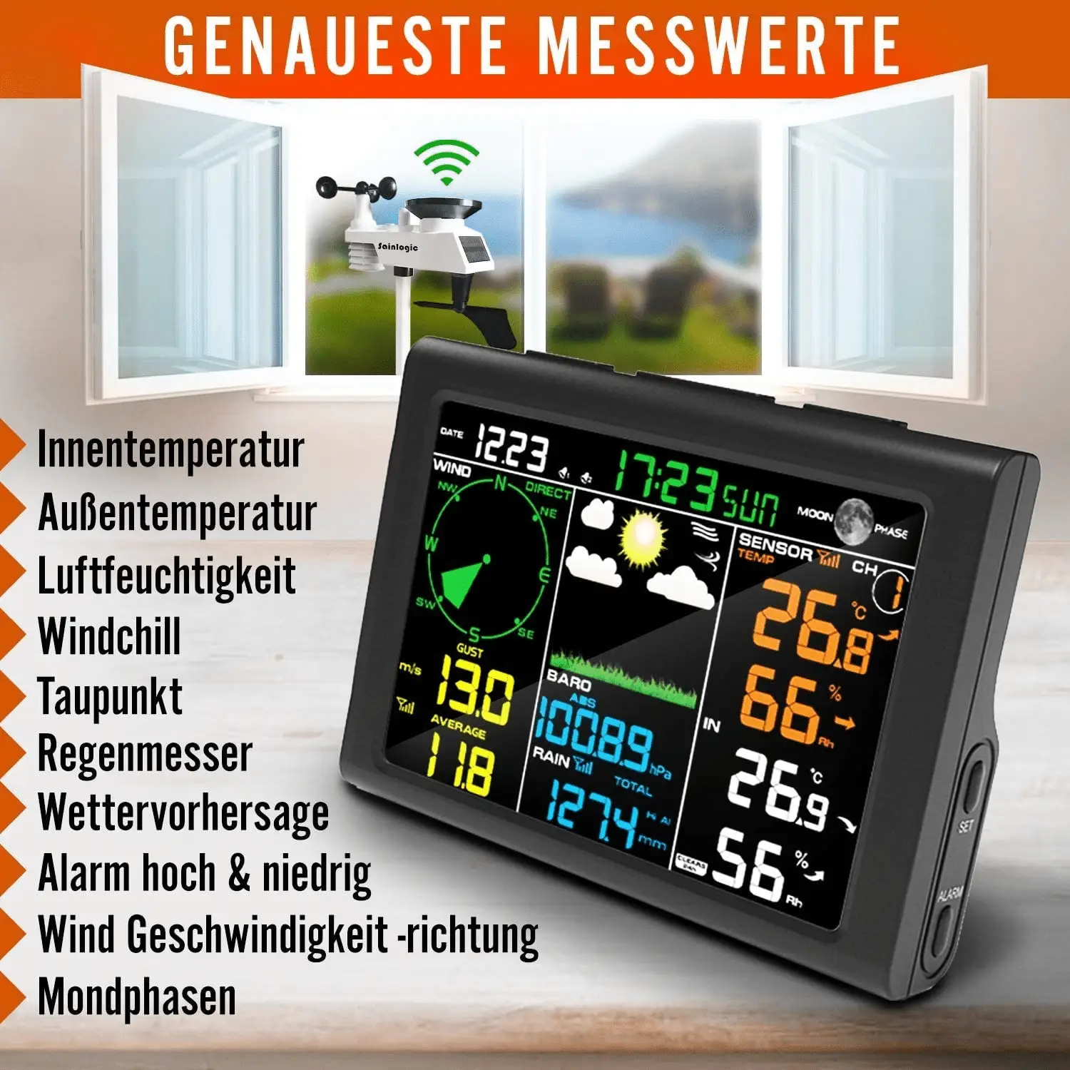- ?PREVISIONI METEO ACCURATE?: Prova comodamente le informazioni meteo personali. La stazione meteorologica misura la velocità del vento, la direzione del vento, le precipitazioni, la temperatura esterna, il sole e fornisce anche previsioni meteo e frasi lunari.