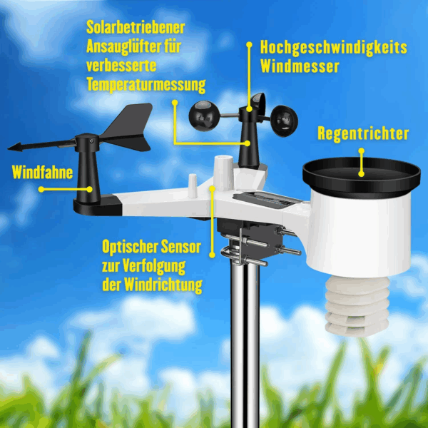 • Questa stazione meteorologica può misurare la velocità del vento, la direzione del vento, le precipitazioni, la temperatura e l'umidità esterne, la radiazione solare e la radiazione ultravioletta.