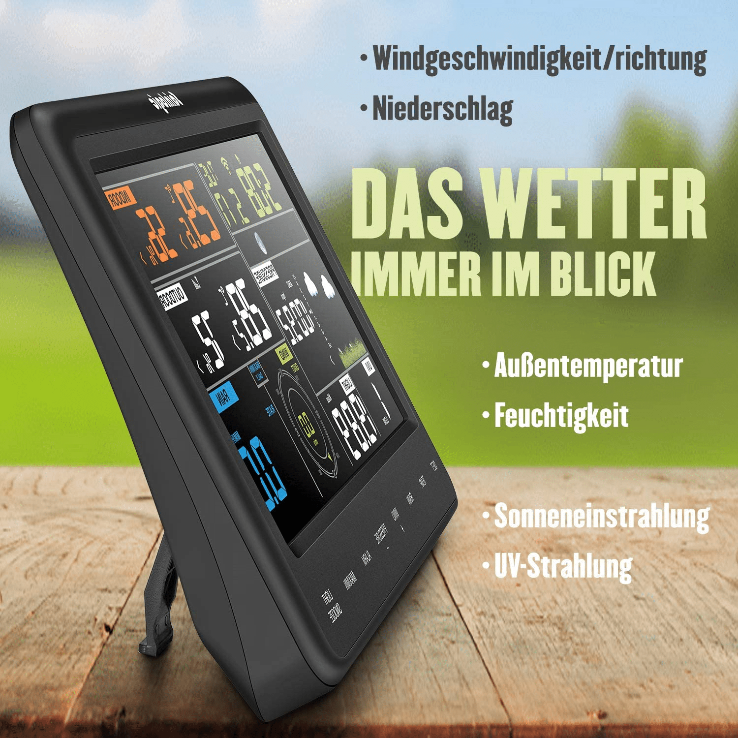 PANORAMICA: Ampio display a colori (15,7 x 7,6 cm) di facile lettura, unità esterna senza fili "All In One" con termoigrometro integrato nel design a Y (temperatura, umidità, velocità del vento, direzione del vento, precipitazioni, raggi UV e solari) – Modulo Wi-Fi integrato nell'unità display – App Android/IOs per una facile configurazione W-iFi e trasmissione al server meteo.