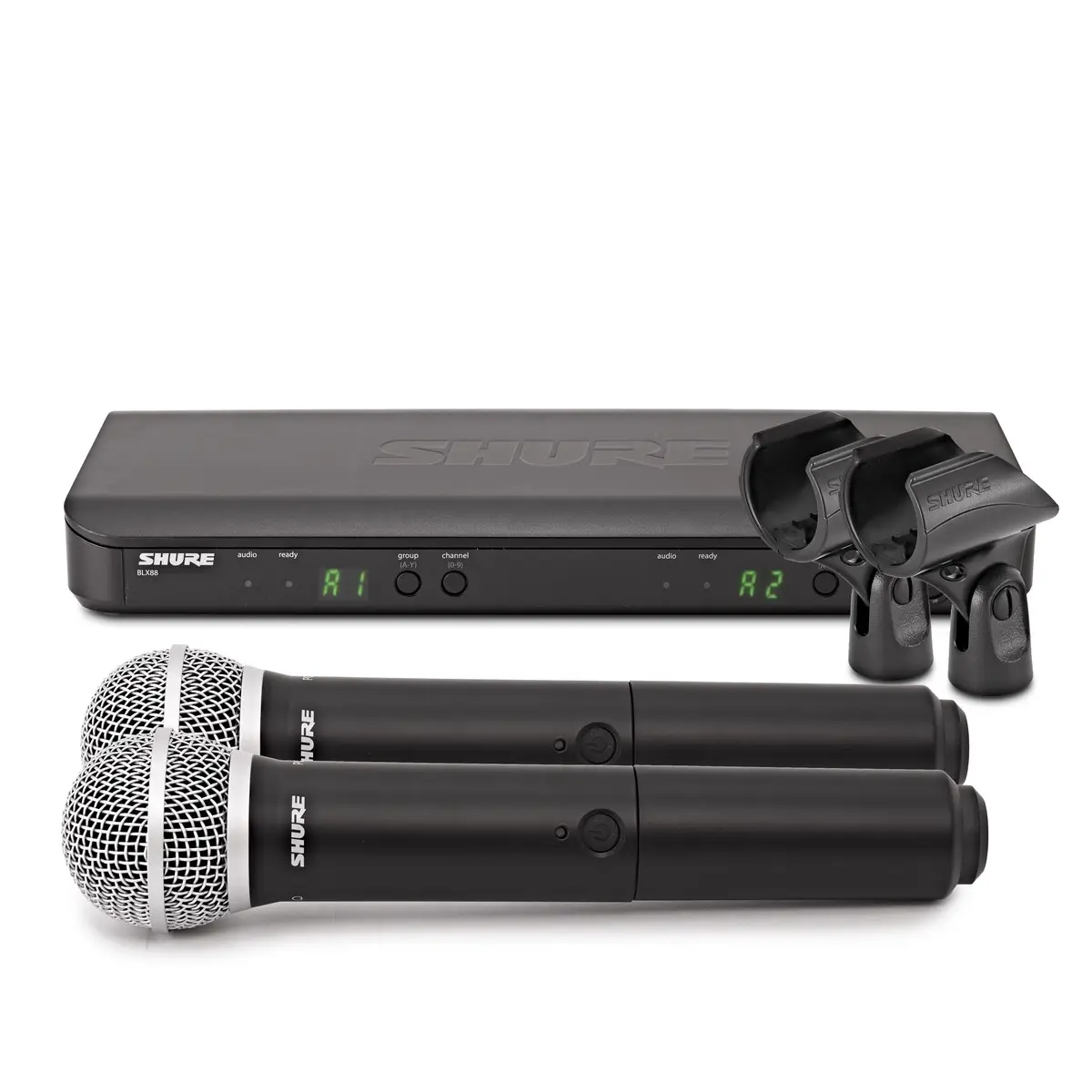 Il set include: doppio ricevitore BLX88E, due trasmettitori portatili BLX2 con capsula microfonica PG58 e clip per microfono