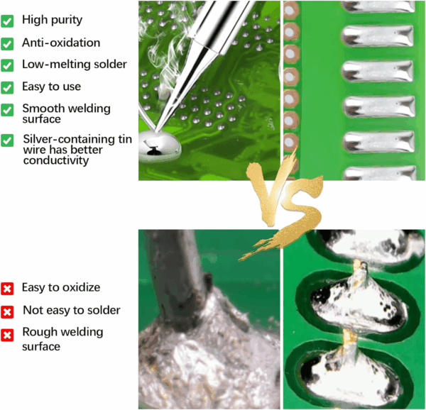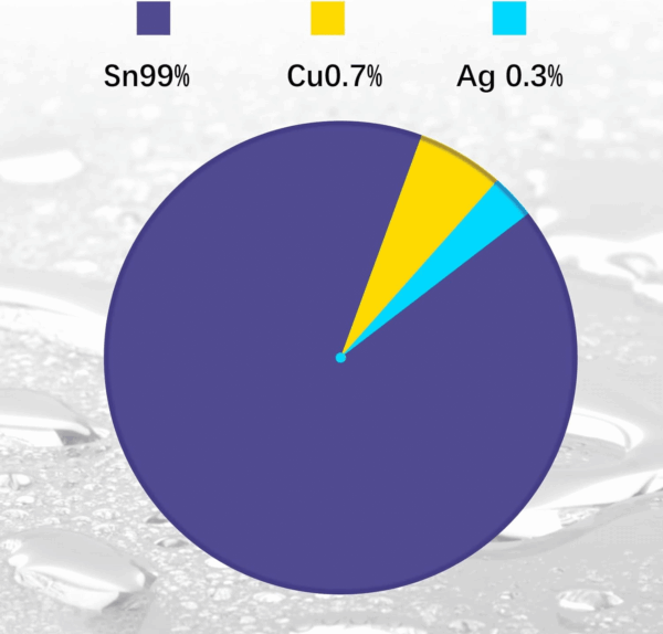 - Composizione della lega: Sn (stagno) 99%, Ag (argento) 0,3% e Cu (rame) 0,7%