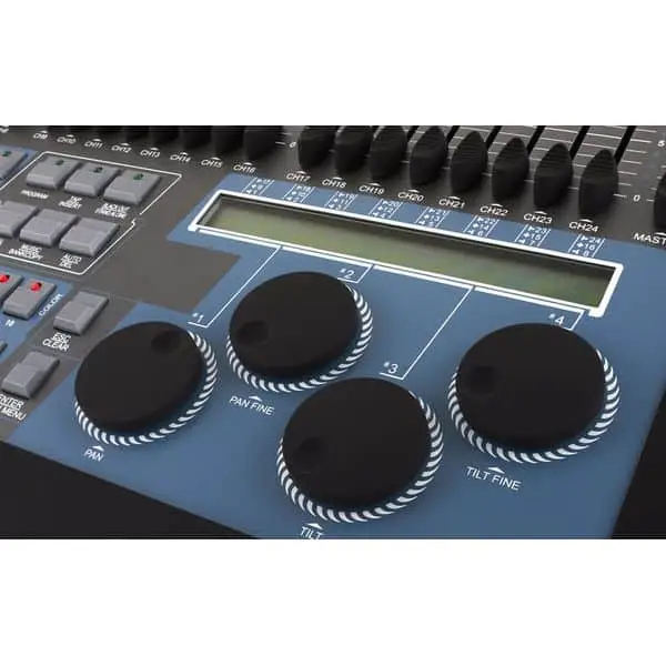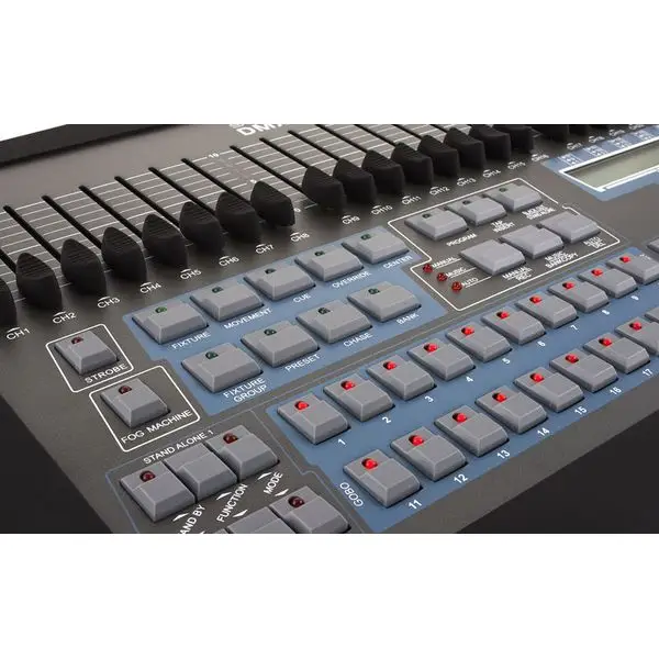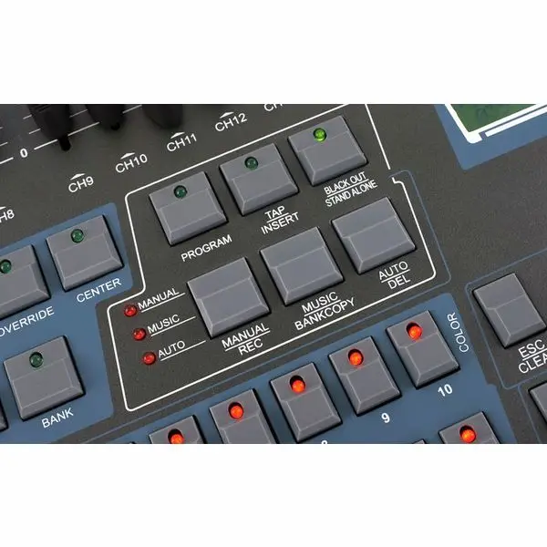 - Disposizione chiaramente strutturata dei comandi e del display LCD per un funzionamento intuitivo e una semplice programmazione degli spettacoli di luci