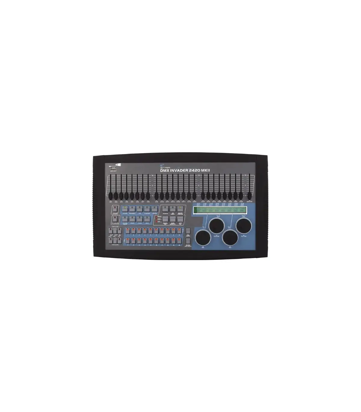 Remake del DMX Invader 2420 con master fader, molte nuove funzionalità e miglioramenti del software. Controller moderno per faretti DMX come teste mobili, faretti LED con miscelazione cromatica RGBA/ RGBW e molti altri. I backup dello spettacolo di luci o gli aggiornamenti del firmware ora possono essere eseguiti facilmente tramite la porta USB. Le innovazioni del software includono lo sfasamento degli effetti di movimento e la miscelazione dei colori dei faretti LED RGBW o RGBA.