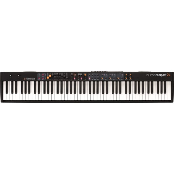 Studiologic Numa Compact 2X Performance Keyboard compatta e leggera; keybed semipesato 88 tasti con aftertouch ospita 3 diversi sistemi di sintesi: organo tonewheel a modellazione fisica, sintesi virtual analog e 1 GB RAM per i Sample; 88 suoni Split/Layer: piani acustici, elettrici, tastiere, organi, ecc., articolata sezione effetti, 9 Slider che agiscono come Drawbars, come controlli timbrici o MIDI. Speaker interni 10W x 2, porta USB MIDI & Audio.